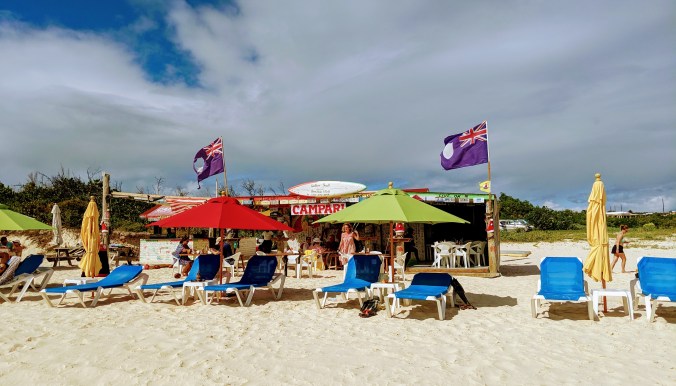 We anchored in Road Bay and after a brief nap, cleared customs with the nicest customs agents in the world. It’s free to clear in for little boats like ours. I’m pretty sure they figure we’ll spend the money we saved in the restaurants! Road Bay was a nice change from the forced merrymaking of the BVIs in high season. The beach is made of the softest sand ever and is lined with beach bars and restaurants. There were only about four charter boats and a handful of cruisers in the anchorage. And the town of Sandy Ground is right there – so it’s a dynamic mix of visitors and locals.