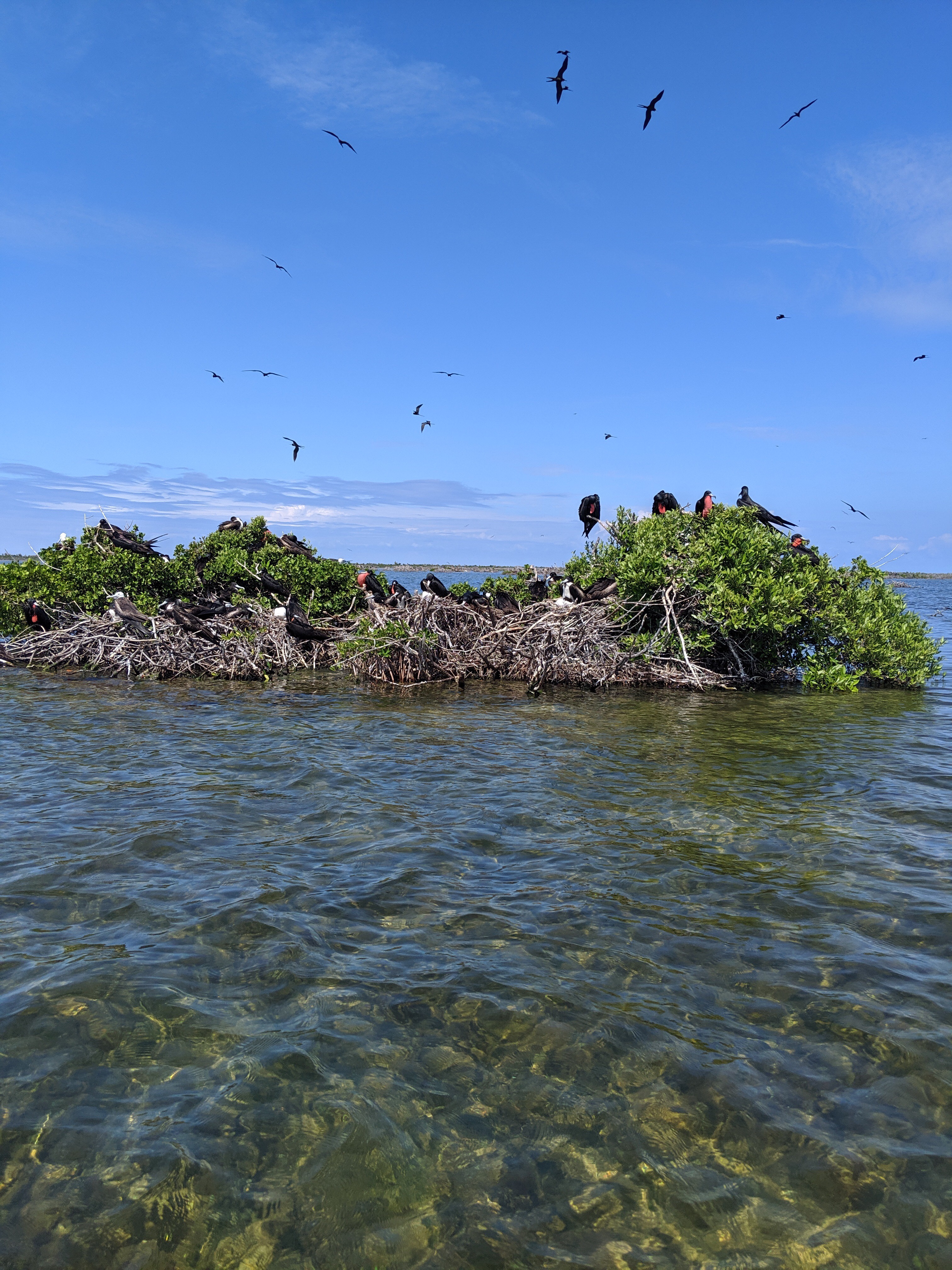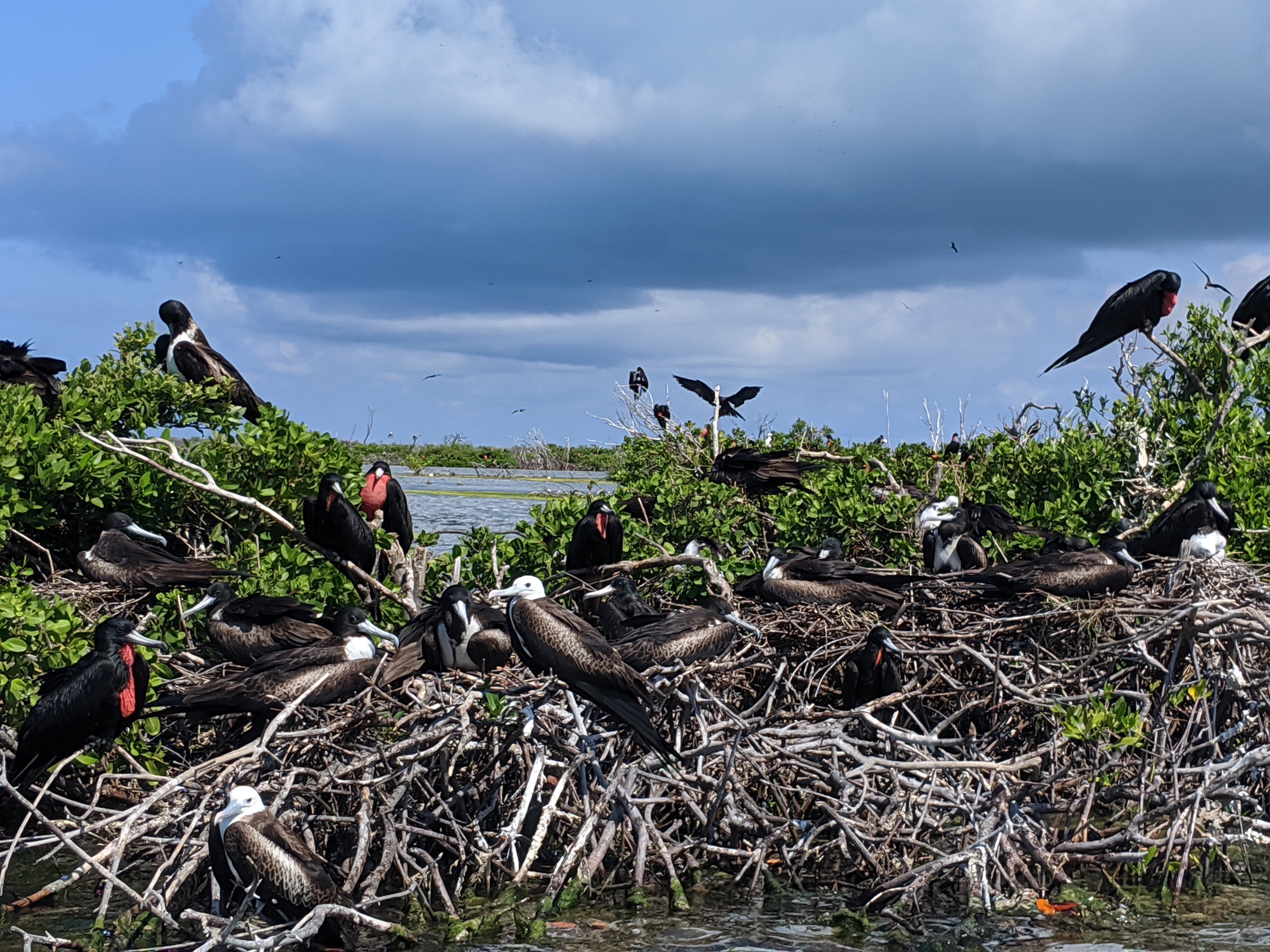 After our tour of the Frigate Bird Sanctuary, our guide George Jeffreys steered his Boston Whaler north in the lagoon to a spot near the ruins of the old Lighthouse Hotel. Capt. Mike and I kind of looked at each other, like “Where’s he going? I thought he was taking us back to our boat” But George found some magical unmarked spot and lo and behold! Raised up a big lobster trap and dumped it in the boat. Silly me wondered whether there would be a lobster in the trap. Well, there were at least a dozen! George used a stick to pull out all of the lobster that were over the legal size for fishing – seven in all. For $15 we had the makings of a wonderful dinner!