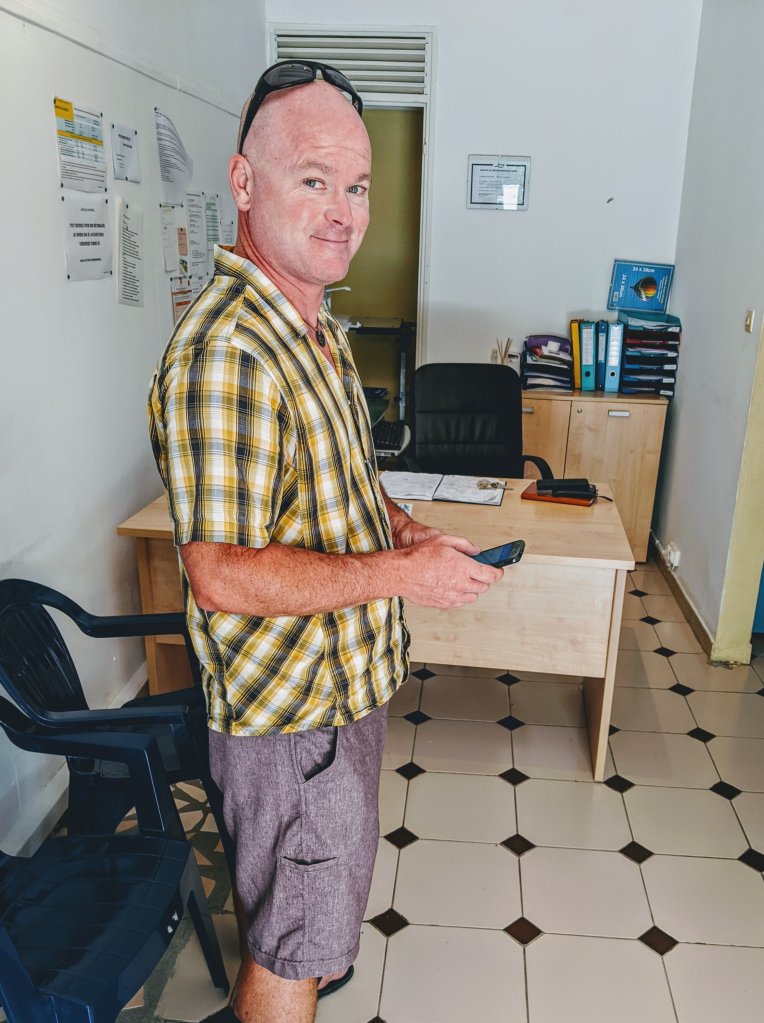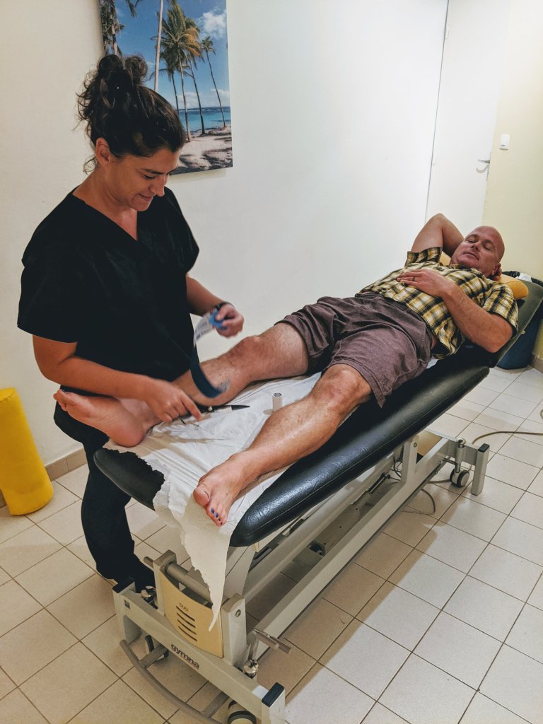 Mike and I loaded Google Translate on our phones, and practiced what to say simply and clearly (Not too many words. Bottom line up front.) And we rented a car to travel from the marina to Kinésithérapie Les Salines to meet with Ana at 2pm on Thursday. And … Ana is wonderful! She’s originally from Spain, now lives in Guadeloupe, and she speaks Spanish, French, and a little bit of English. And she’s a sailor! She evaluated Mike; bent, manipulated, and twisted his leg in all kinds of ways. In a mixture of French and English she told us that the ACL felt fine. But that it might be a combination of a strained ligament and bone bruise and that he should rest and ice and buy a brace at the pharmacy. She taped Mike’s knee using blue kinesiology tape that matches his toe nails. And she manipulated his leg a bit to help it get back into alignment. She gave us her card and asked us to call within a week to let her know if it felt better, or to make another appointment.