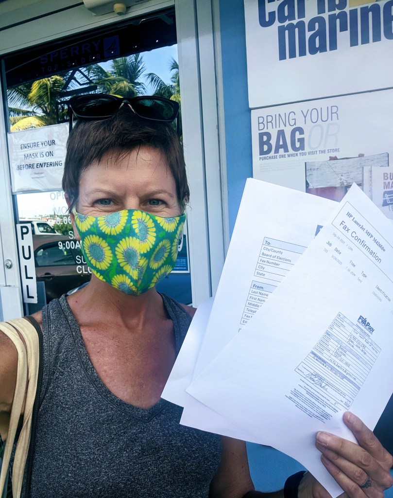 Florida doesn’t allow you to return a ballot via email (some states do!) so we also signed a waiver acknowledging that our faxed ballots wouldn’t be private. And then I set off in search of a fax machine – remember those? I spent about a day and a half walking back and forth between the boatyard and the Budget Marine chandlery with a folder full of paperwork trying to make it there during business hours (Island time is no joke!) and trying to find one with a fax machine that would function correctly and stay connected for 5 whole pages. I phoned Clay County directly a couple of times and spoke to a lovely, polite southern woman who checked that the fax machine was indeed turned on, and even gave be a backup fax number when the first one didn’t work. You gotta love that southern politeness! Finally, and after paying 2ec per faxed page, success! My mantra is, “Well it’s a heck of a lot cheaper than FedEx!” I have fax transmission sheet to prove my ballot went through. Now, fingers crossed that my signature from 2020 matches the one I gave them when I registered back in 2017 and I should be confident that Capt. Mike and I did our part to make our votes count and our voices heard. Even from the islands, mon.