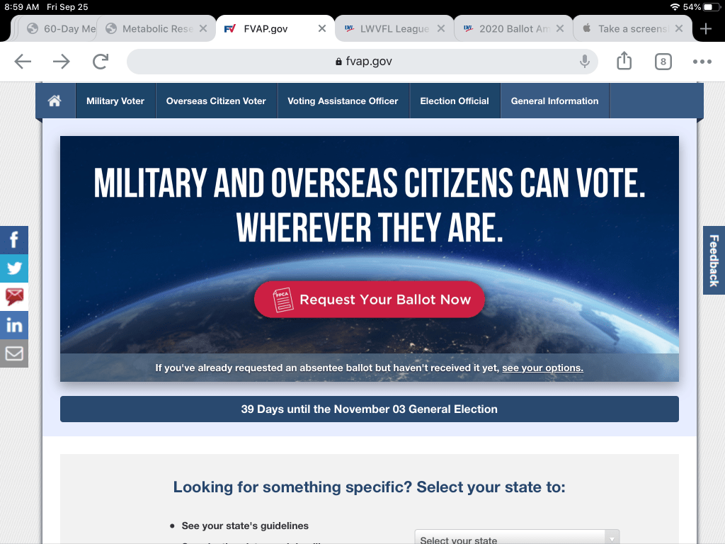 When we sold our house in Colorado, we established residency in Green Cove Springs, FL. (Yep. You can go ahead and call Capt. Mike “Florida Man.”) Florida is a no excuse vote-by-mail state. That means any registered voter can request a vote-by-mail ballot, without needing to prove a hardship or disability or that you’ll be out of town on Election Day. And, regardless of what the Pres says in his tweets, there’s no difference between an absentee ballot and vote by mail in Florida. in fact, in 2016, Florida removed the words “absentee ballot” completely from all government websites, ballots, and documents. When we registered to vote in Clay County, we ticked the box requesting to vote-by-mail and each time we return a ballot, we tick the box again stating we want to continue voting in this manner. That’s all well and good when we’re in the US, and we can get our mail forwarded to us, but what do we do when we’re overseas?