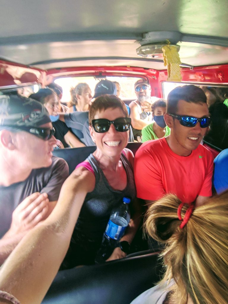 The thing that came closest to dampening the fun was in fact the bus ride to this first Hash. It was so popular that local taxi driver Shademan ran two whole busses from the cruiser-popular areas in the south bays of Grenada to the event. Now, the “bus” is really just a van with 4 rows of bench seats. Our bus to the hash crammed in 22 people (and one dog) for a ride that took over an hour and a half in the late summer heat. We had to alternate who could sit back in the seats, versus who had to sit on the very edge to fit so many full sized adults and kids.