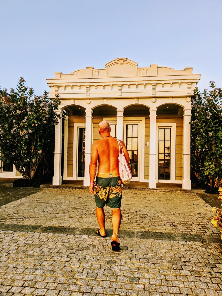 Now, did I mention the bath house? From the outside, it looks like a Greek temple, or maybe a bank. Inside, it’s delightfully air-conditioned, decorated with stylish and comfy seating, and has clean and spacious showers with unlimited hot water. It’s a cruiser’s dream!