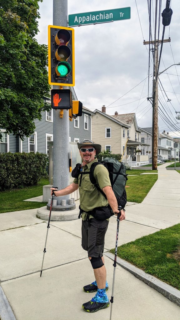 2.8 miles (+6 extra miles) After breakfast at the Moonlight Diner, we walk two miles through Williamstown and North Adams to get to the Appalachian Trail (the At and the LT are the same trail for about 110 miles) Then we hike an uphill 6 miles to finally arrive at the Vermont line, and the official start of the Long Trail! I’ve got the First Day Blues (sore toe, bad knee, heavy pack, mud, slow going). It’s very humid today – clothes soaked through and sweat dropping. Rain started AFTER we arrived at shelter, Yay! Usually we’re not so lucky. Stayed in the shelter with a couple from St Pete doing AT, with trail names Shortcut and Adams.