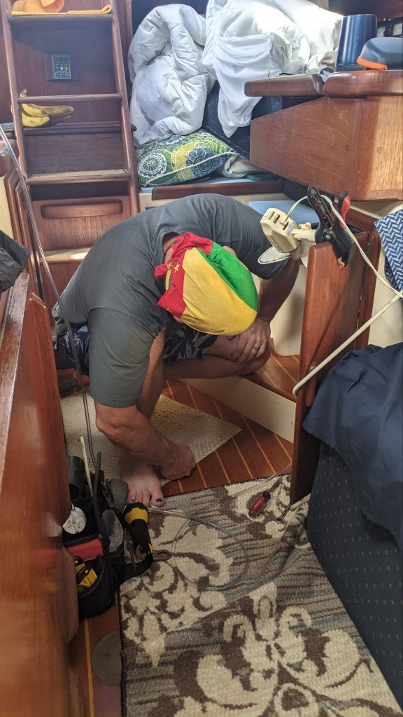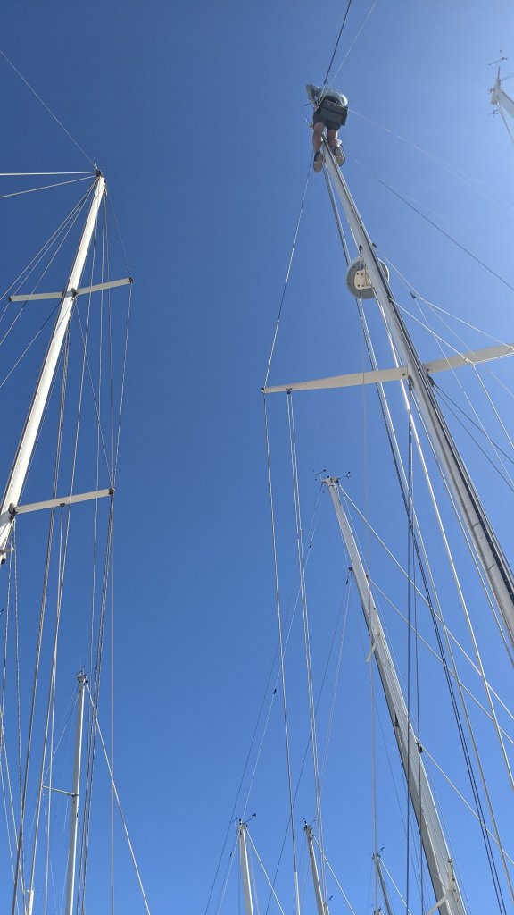 I’ve lamented the cost and complexity of marine insurance in the past. Well, we’ve had the same Jackline policy through Markel Insurance for four years now, and this year they required a professional survey on Sanitas before renewal. This is similar to hiring a home inspector before you buy a house – an independent third party inspects the entire boat for any potential safety or maintenance issues and documents all of the findings. On our dime, of course. Sanitas came through the survey with flying colors, and we only had to make minor corrections, such as replacing outdated flares to address the findings. We thought we were in good shape there until, one day after we splashed and we’re back on the water, our insurance agent sent us an email stating they now require an aloft rigging inspection as well. What the deuce? We just went through the whole survey rigmarole using the old guidance, which did not require a rigging inspection. The good news, we were able to find a company that would inspect in the water, so we didn’t have to pay for another haul out. The bad news, they found a small flaw in the wire cable of our backstay, and we had to replace it. By now our dreams of a quick departure from Grenada without spending a fortune were shattered.