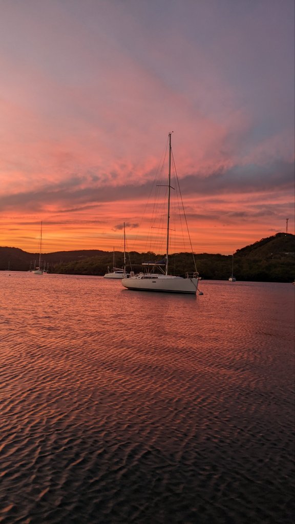 So, see? No need to worry about me. We’ve managed to balance the nasty boat yard repairs with friends, fun, and sun. And after all that, we even managed to provision Sanitas and to get her ready to start sailing again. ‘Cause that’s why we’re here, after all. Next blog post, we’re heading north! But for now, I’ll leave you with yet another beautiful sunset. 🌅