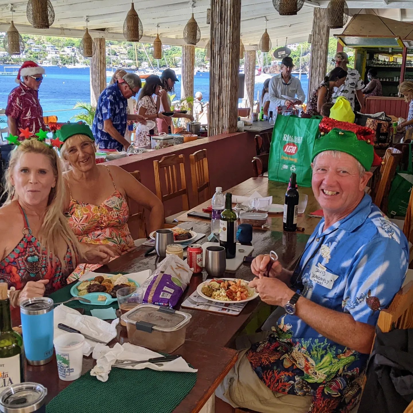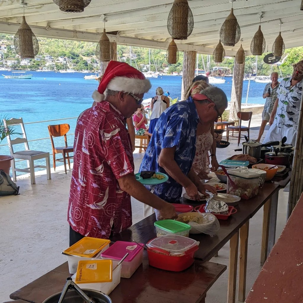 The main event of a Bequia Christmas is without a doubt the Cruisers’ pot luck at the Fig Tree. The owners, Cheryl and Lafayette open the restaurant to sailors free of charge and light of the grills. And folks from all countries and all languages gather to grill meats, share sides and desserts, and drink festive cocktails. All within feet of the lapping waves against the Belmont Boardwalk. It’s a total blast, and I’m so grateful for the Fig Tree’s hospitality.