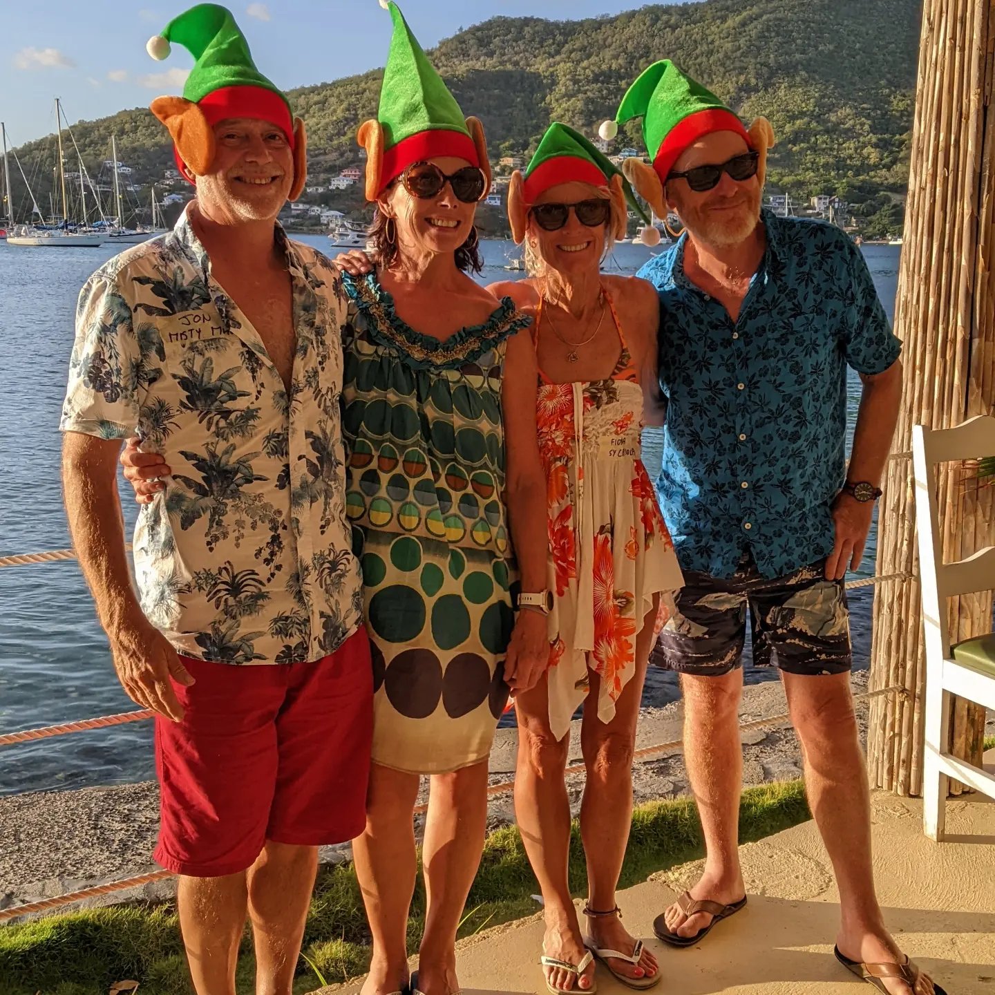 Now, every restaurant on the island was competing for our business for holiday dinners. But I accidentally wandered into the Porthole one afternoon and ordered a soda water and started chatting to the owner. The Porthole restaurant and mini mart is a Bequia institution, operated by Mr and Mrs T for 40 years and famous for its delicious rotis. The couple have gotten older and struggled to keep it up (not to mention Covid) so their son Gladwyn and his partner Linda moved back home from New York City to take over. They’ve put a ton of work into painting and modernizing and the place looks fantastic. Linda told me they were planning a grand opening party for Christmas Eve with lobster and Mrs T’s traditional recipes for salads and sides so I jumped at the chance! We shared a table with three other cruisers and had a lovely evening – Elvis played Christmas songs on the steel pan, the food was delicious and the wine flowed, and we finally experienced some Christmas cheer. Even if the dinner we were promised at 7:00 didn’t actually get served until 9:00. Island time, lol!