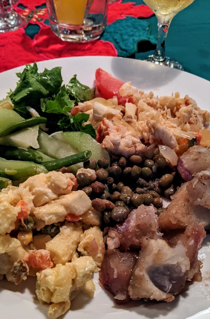 Poached lobster, breadfruit salad, stewed pigeon peas, cinnamon yams, green beans and christophene, green salad