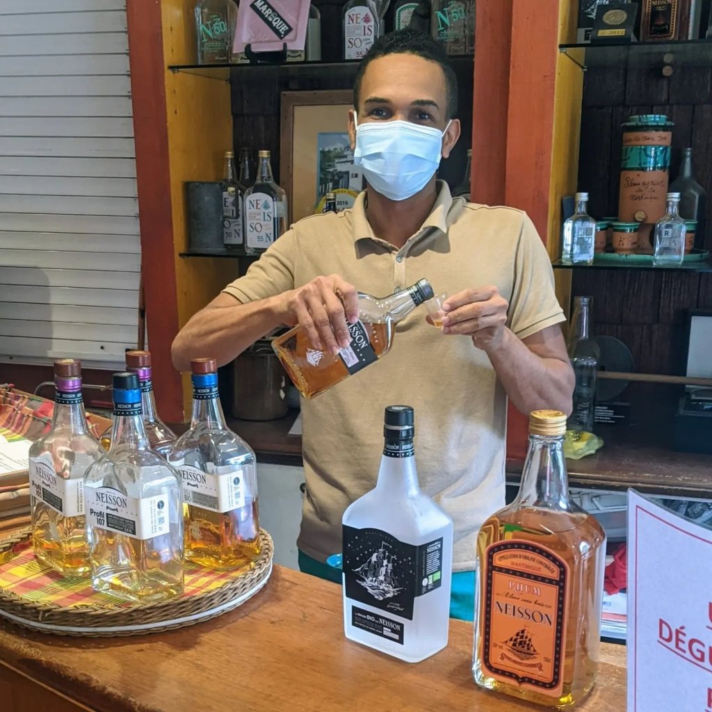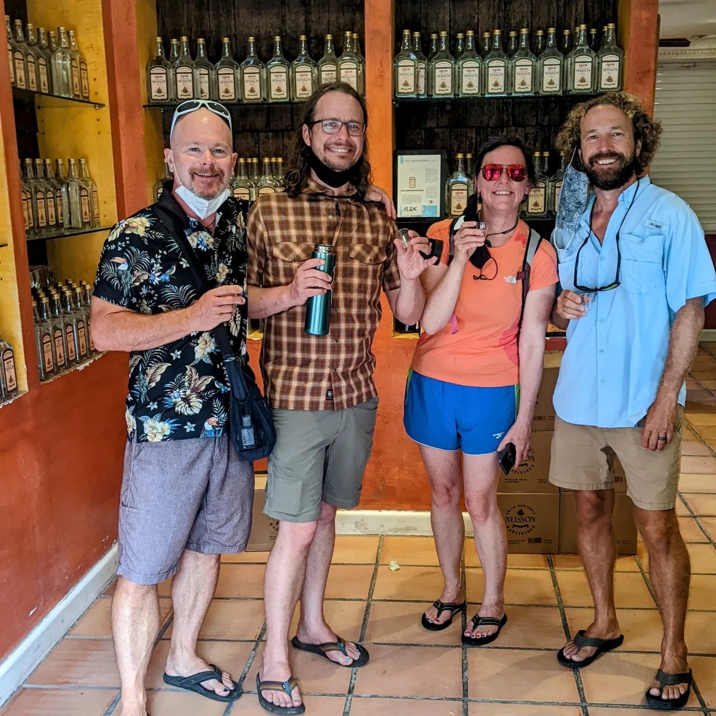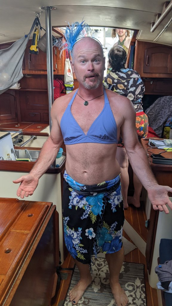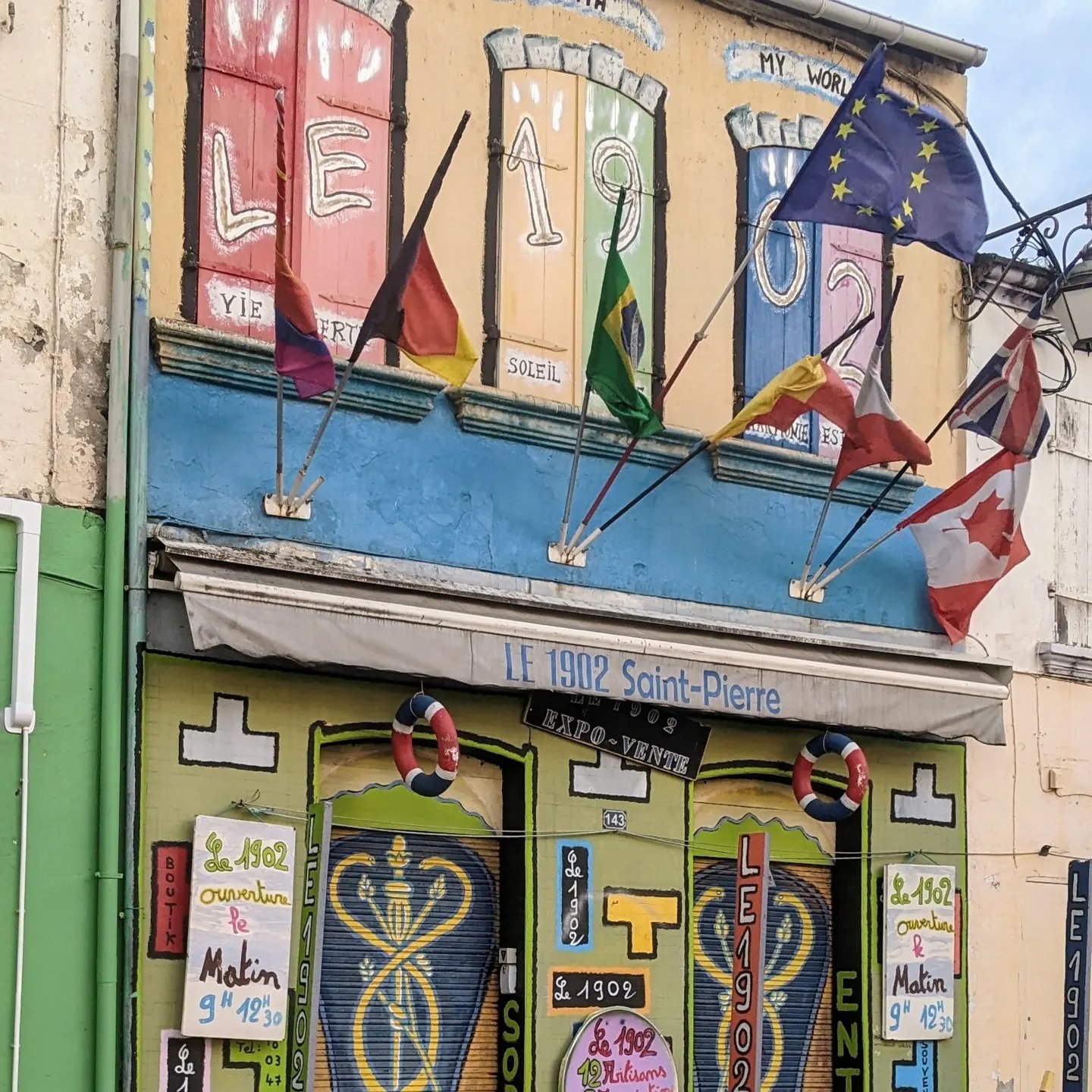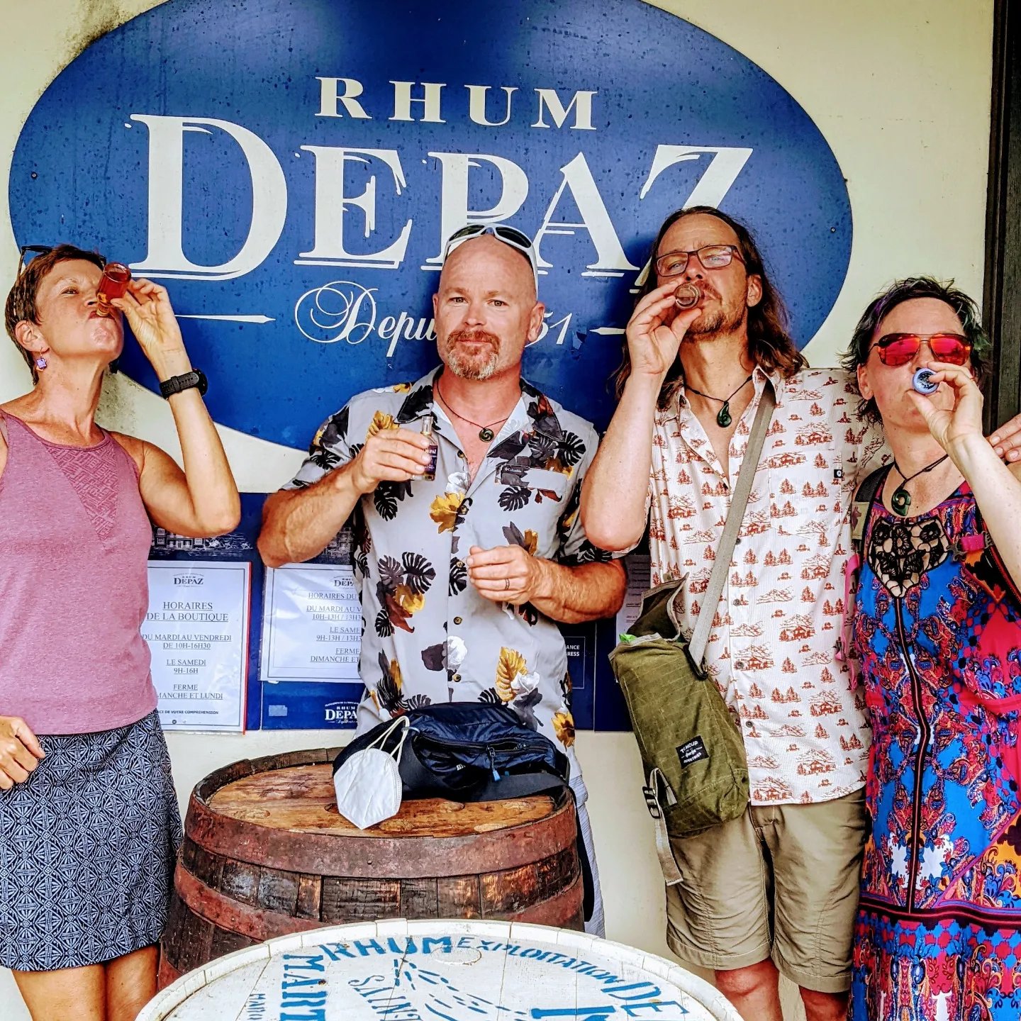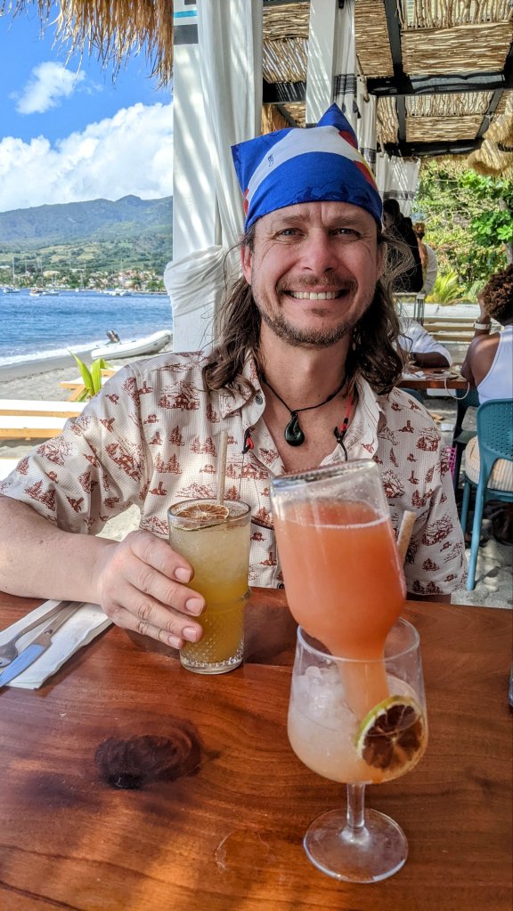 French hiking trails are amazing! They are well maintained, with water bars, steps, and sometimes even boardwalks. They are marked with signposts about every half-kilometer and with very clear paint marks on trees and rocks. This trail isn’t very technically difficult. It follows the coastline closely, sometimes along sandy beaches and sometimes through mangrove forests. At the end of each beach, you climb a headland for wonderful views of where you’ve been, and where you’re going. Much of the hike is exposed and very hot (as you can tell by the photos of happy little cacti) We wore our broad-brimmed sun hats and even a long sleeved sun shirt at times and we drank A LOT of water. About halfway through the hike, we came upon an oasis. After a couple hours of seeing almost no one in the beautiful wilderness, we stepped out onto a beach with a road and a parking lot nearby. Being a Saturday, we were suddenly surrounded by sun bathers, selfie takers, wind surfers, and …. beach bars! I ordered “beaucoup de boissons”: a coffee for each of us for that caffeine boost, a planteur for each of us with its refreshing ice cubes and fruit juice sugar for energy, and a small Didier to share – because you can never have too much water! I had to force us to start walking again before we got too comfortable and started ordering ti punches and gave up on the hike all together.