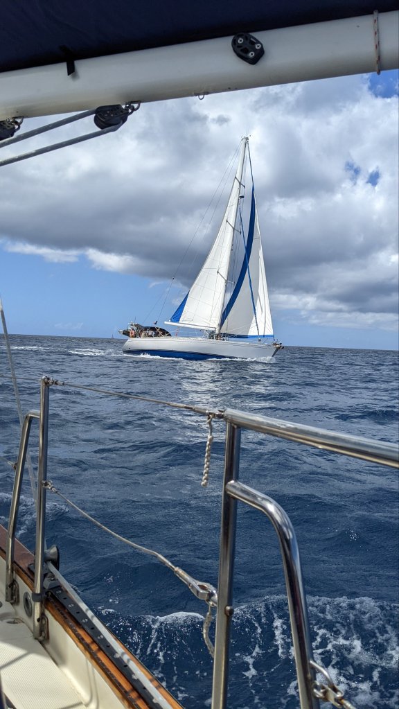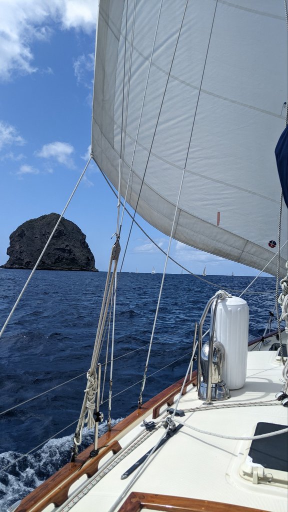 A couple of miles out from Ste Anne, with the masts of that massive anchorage in sight, we could no longer keep the staysail full of wind, so we attempted to furl it. Nope! The furling line was snagged on something so every attempt to put the sail safely away for the day resulted in loud and violent flogging instead. Capt. Mike went forward to investigate and discovered that we had an overwrap on the furling drum. It was going to be much too difficult to resolve it in the rough seas and high winds, so he decided we were better off simply dropping the staysail to the deck and fixing the furler later when we’d arrived in the protected anchorage. I took the helm to keep us pointed into the wind. And Mike, Micki, and Nathan went forward to wrestle the sail to the deck by dropping its halyard. Good thing it was the small sail!