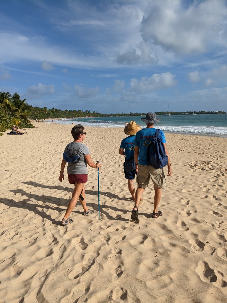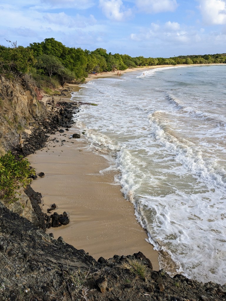 The best part about anchoring in Sainte Anne, Martinique is that one of the most beautiful beaches in the Caribbean is just a short walk away. Ok, it’s a 3-mile walk each way, but that’s par for the course when you don’t own a car and you go everywhere on foot! In less than a week, we’ve already done the walk twice and I think I could do it every other day without getting bored. The path is gentle and shaded, following the coastline beneath a canopy of mangrove branches. You frequently have the option of emerging onto a beach to dip your feet in the water and cool off, and often there’s a surprise! Maybe a wooden swing swaying gently above the tide. Maybe a massive picnic party, complete with a DJ and caterer, maybe (toward the end of the hike) a nude beach where everyone lets it all hang out.