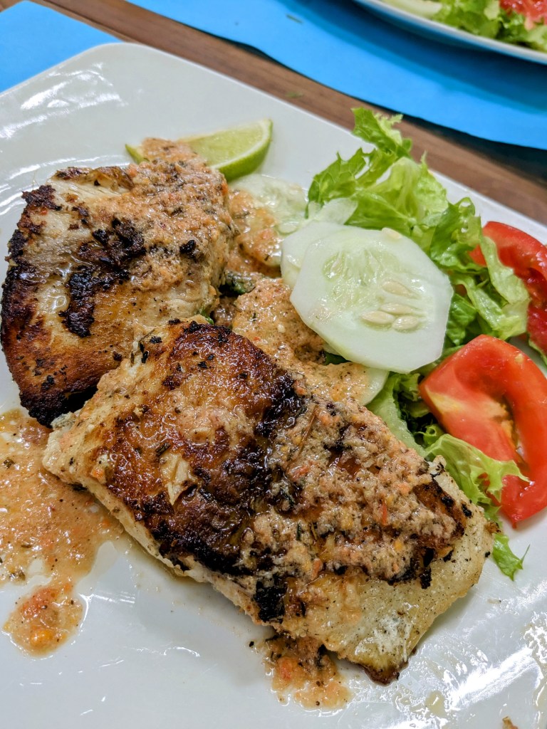 On our first visit this January with our friends Chantal and Gary on SV Maracuja, we arrived too late for lunch but we were able to order cold drinks to go and enjoyed the people watching from a shady spot under the palm trees. The second time, we planned ahead and arrived at Chez Olivia just as lunch service started. Honestly, we hardly even needed to look at the menu. Planter’s punch? Check ✔️ Bottle of fizzy water, bottle of rosé? Check ✔️ Hmmm … Really the only tough decision is which fresh fish dish to order. Capt. Mike went with our favorite – tuna ceviche with coconut milk (thon à la tahaitienne) I always love the fresh grilled fish – although i did fail my French test a bit by not asking what is the fish of the day. I clearly look like a tourist because madame decided i would prefer the filet of daurade. She might actually have looked straight into my soul because I was thrilled with the generous portion, perfectly cooked in a delicious ginger and curry sauce. But if she had told me all of the options, I probably would have ordered the whole grilled vivaneau. I’m a sucker for whole grilled fish!