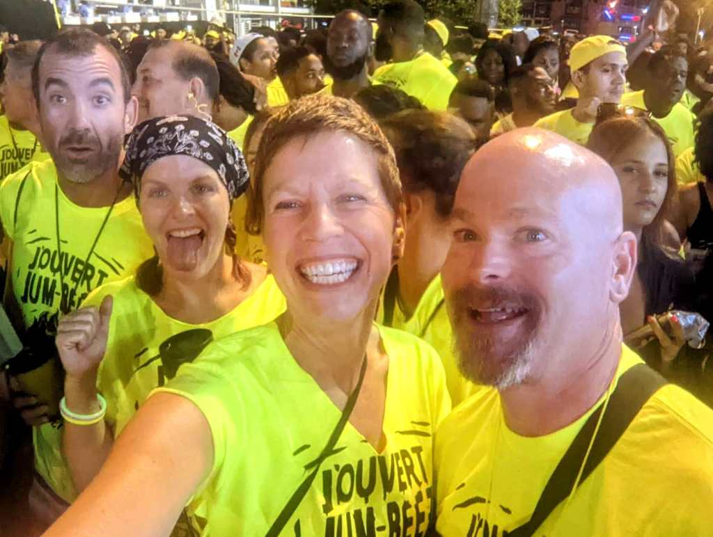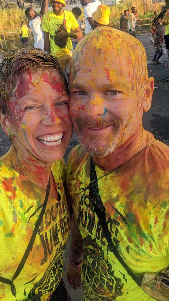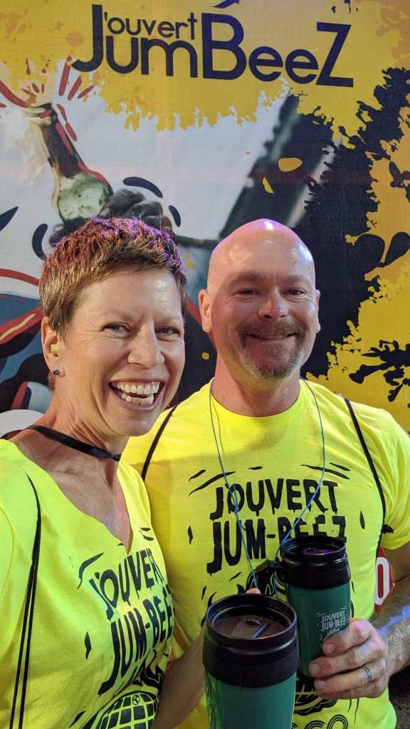 The bar opened at 3:00am (yes, I know this sounds completely and totally nuts) so we had time for a run and club soda in our matching insulated mugs to calm the nerves before the start of the parade. Good thing we packed ear plugs, because the soca music pounded so loud Capt Mike and I had to shout directly in each other’s ears to make our plans to stick together. We’d been listening to the DJ Private Ryan Soca 2023 playlist on Spotify for at least a month, so we knew all the songs and were definitely ready to “jump up” and put our hands in the air just like the Trinis (I’ve still got the song “Come Home to Me” by Nailah Blackman and Skinny Fabulous in my head – it just might be stuck there until next Carnival!)