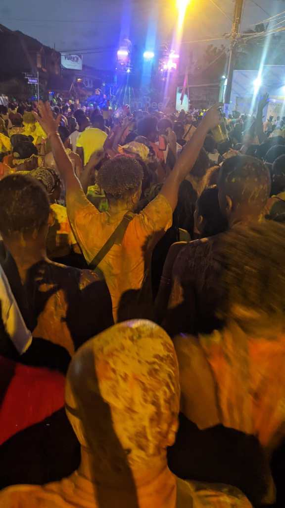 The gates opened around 4:30am, and we slowly followed the trucks out onto the streets of Port of Spain. Mike and I made a pact to stick together and to watch our footing in the dark. Security staff held long ropes on either side of the street, so as long as you followed a truck and stayed between the ropes, it was impossible to get lost. Wow, there was a ton of energy! We didn’t really march, we pretty much bounced our way through town.