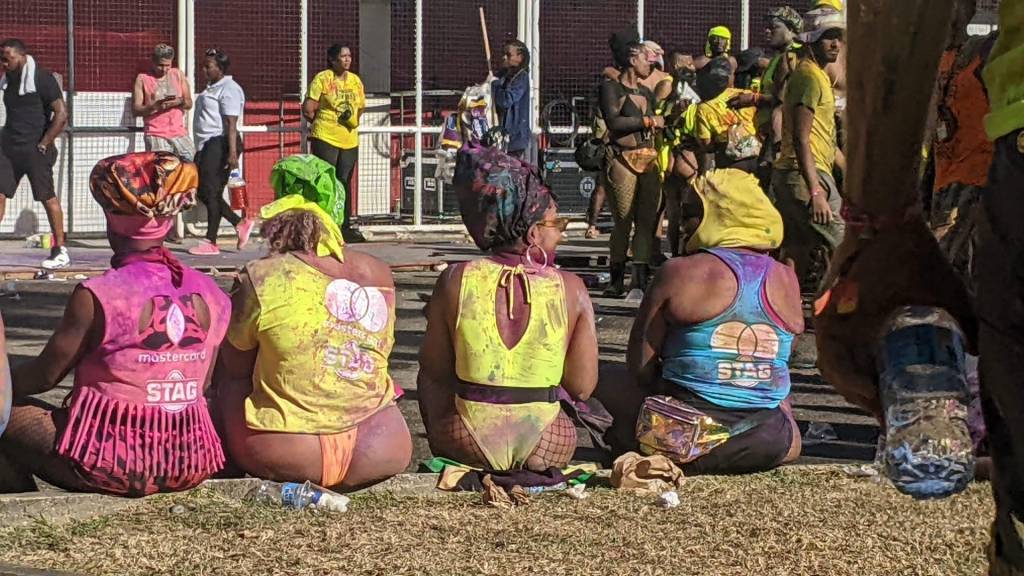 Sunrise was subtle, but we gradually went from watching our footing in the dark to watching the crowds on the sidewalk who were out in force to see the parade. I have to tell you, there’s nothing cooler than seeing a full sized flag waving above the heads of a paint-splattered crowd in the first light of day. Back at the stadium, we “crossed the stage”. The DJs played the most energetic, jumpiest songs in soca and everyone, including the security staff, jumped up and down with hands in the air in celebration of daybreak, rebirth, and Carnival.
