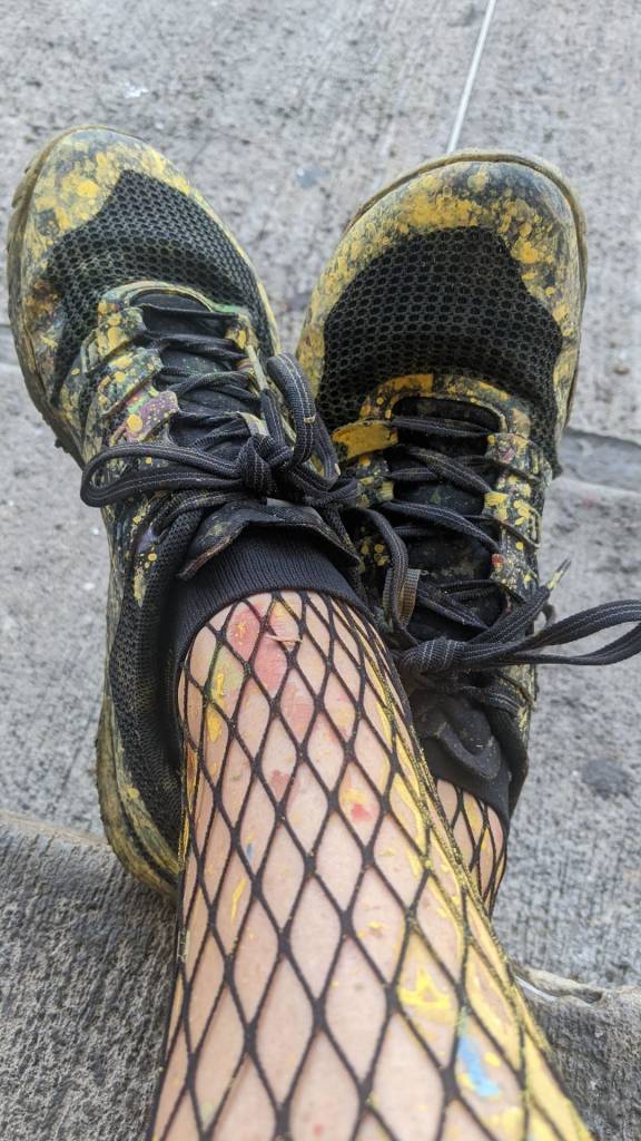 We had just gotten used to the crowds and the deafening music and the light show when the paint came out. Staff passed out plastic water bottles with sport caps full of red, blue, and yellow paint (supposedly washable, but you can’t prove it by looking at my sneakers) We shook our bottles and squeezed, spraying streamers of paint into the sky… and eventually back down onto our heads. I quickly dropped my bottle – there was plenty of paint flying from other revelers and from the trucks without my help. Capt. Mike took a more artistic approach, squirting smiley faces and polka dots on the backs of fellow JumBeez.  At a few points on the parade, colorful powder was thrown into the air to stick to the paint, and mud was splashed around our feet, but I avoided those variations as much as possible! There were even trucks with pressurized paint guns shooting paint 30 feet into the crowds.