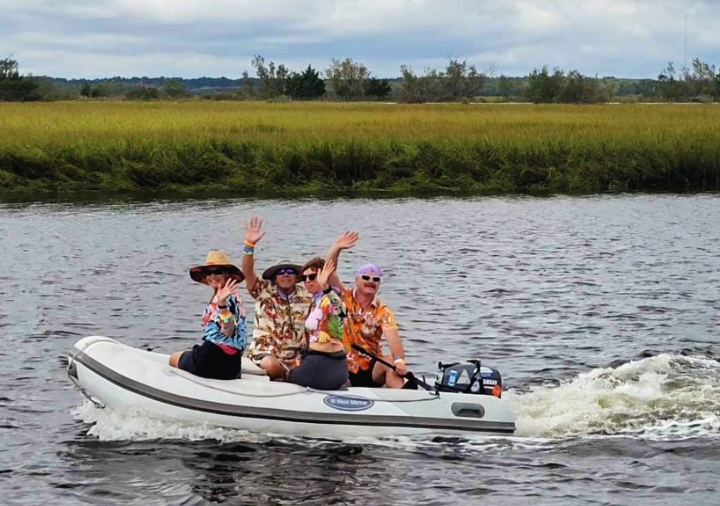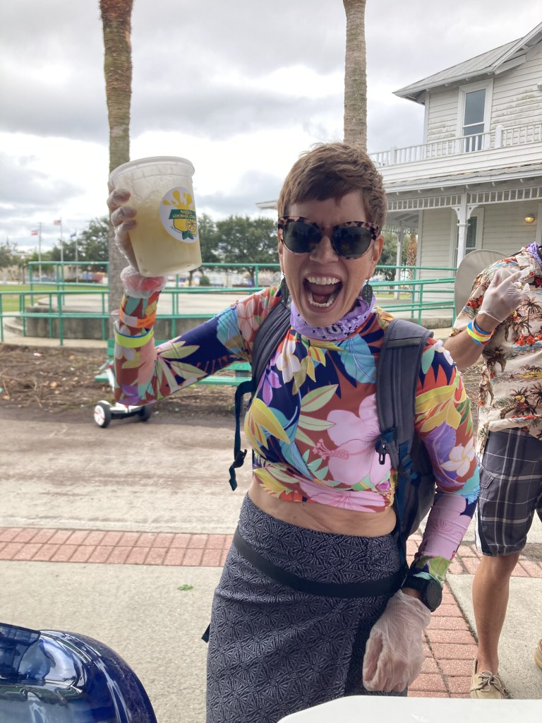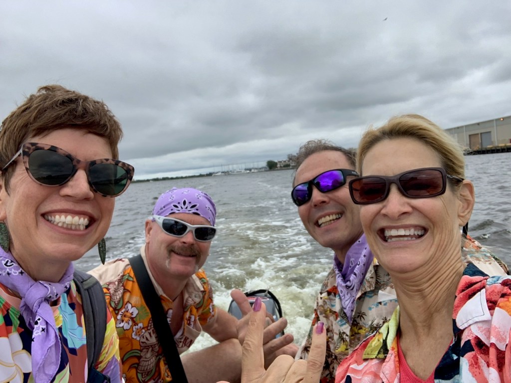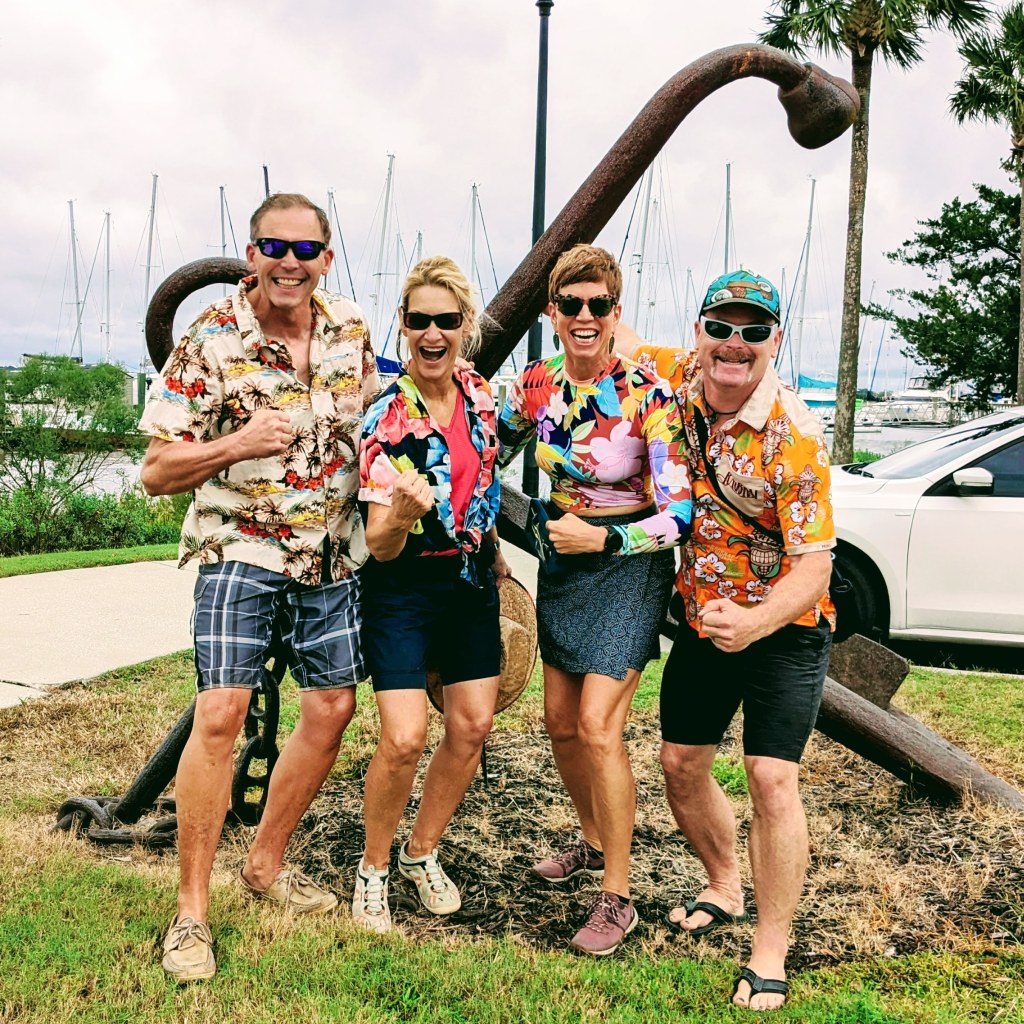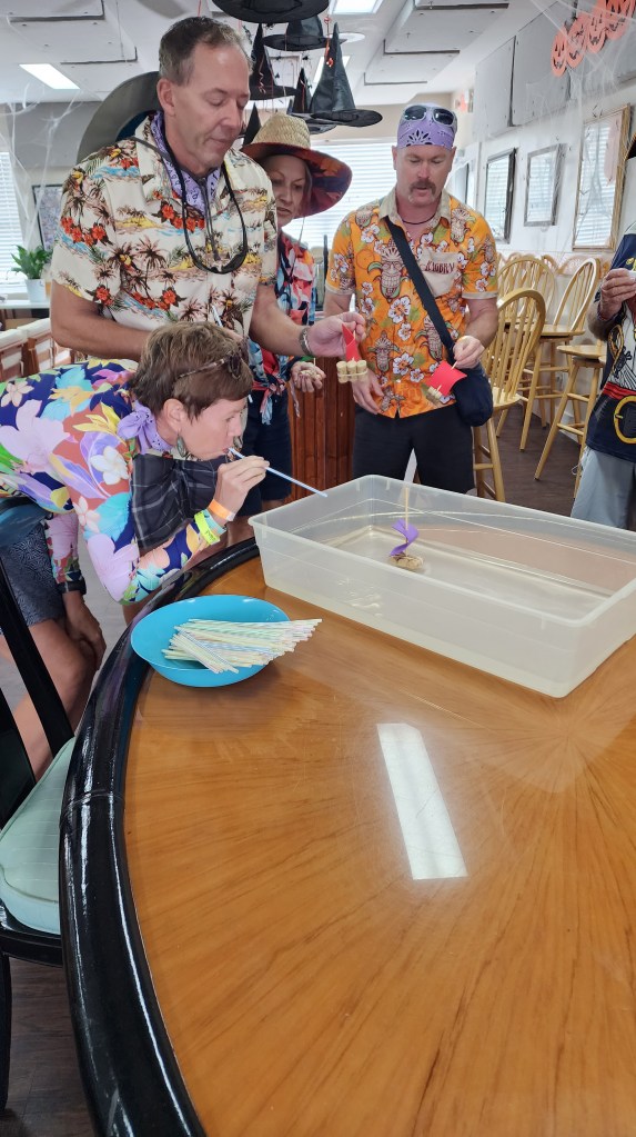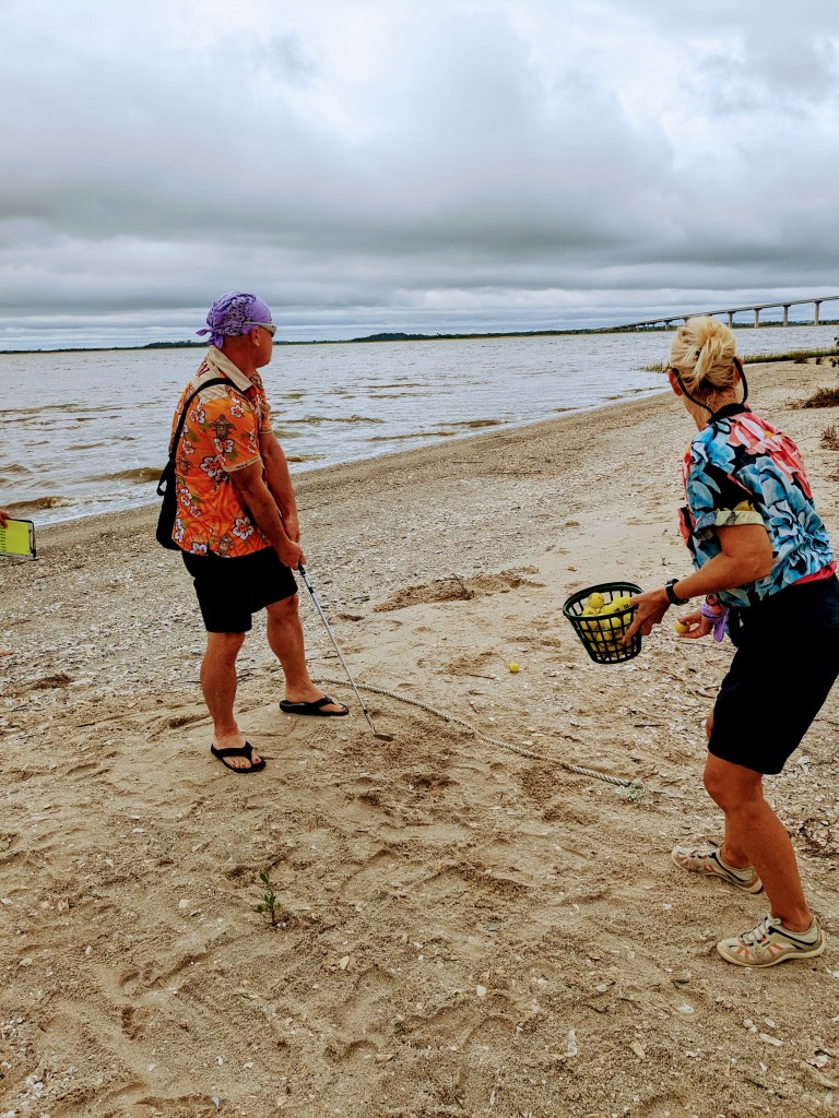 Capt. Mike and I joined our dock neighbors Ann and Frank as team Happy Dreamers ๐ We donned our matching team bandanas and hopped into our dinghy at 10am to tackle our first challenge. We’ve been in one place for so long, it felt strange to be getting splashed in the dinghy once again! We drove to the gps coordinates of our first clue and got really excited when we saw a huge airboat tied up to the dock at our destination. Yep! It was waiting for us! We hopped in, and zoomed off into the bay, traveling much faster (and much louder) than we had in our dinghy! The airboat captain dropped us off at a nearby island where we were given our challenge – each team member had to chip a golf ball into a target. We crushed it! Two minutes and 30 seconds and we were done and back in the boat.