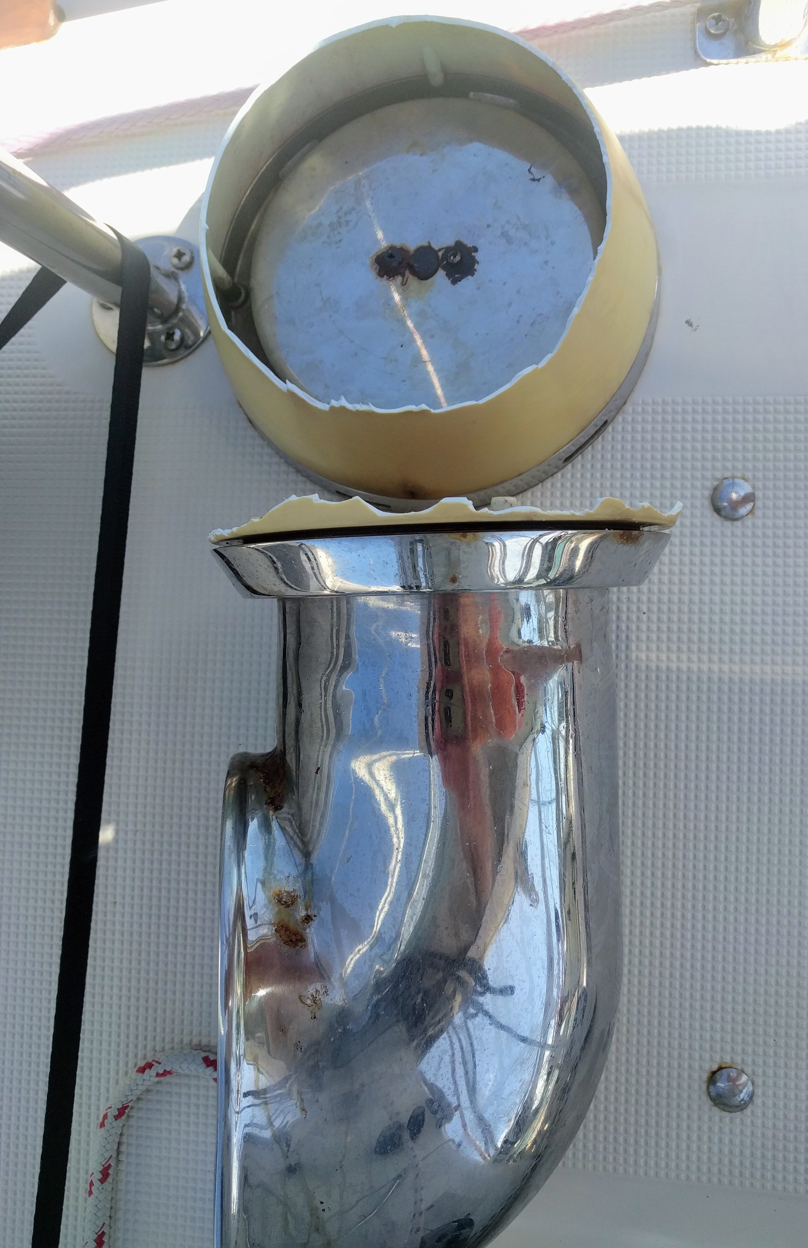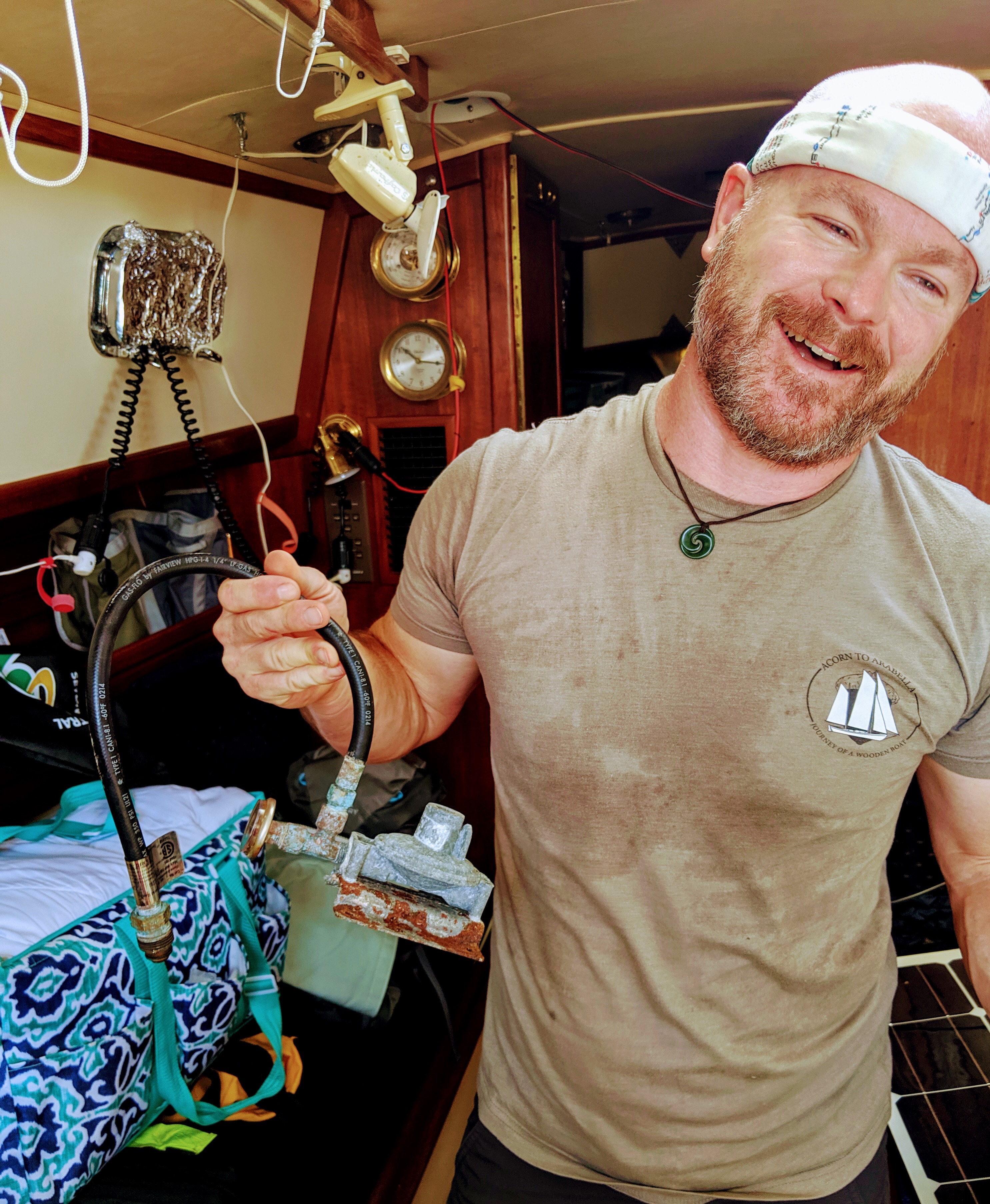 When new sailing friends ask “Which boat is yours?” in an anchorage, it’s kind of hard to answer. “Well, she’s the beige boat. With a beige sail bag. And a beige bimini and dodger. Never mind. She’s the cutter-rigged double ended of no particular color.” That’s practical – light fabric is cooler in the tropical sun, and it won’t fade. But that same strong sun has taken a toll on our canvas nonetheless, and it’s been right on the edge of falling apart this whole season. A couple of times a year, we hand sew the zipper back on the sail bag….again! And the metal frame that supports the dodger is showing right through the fabric there. We’re one tropical storm away from everything ripping right off!
