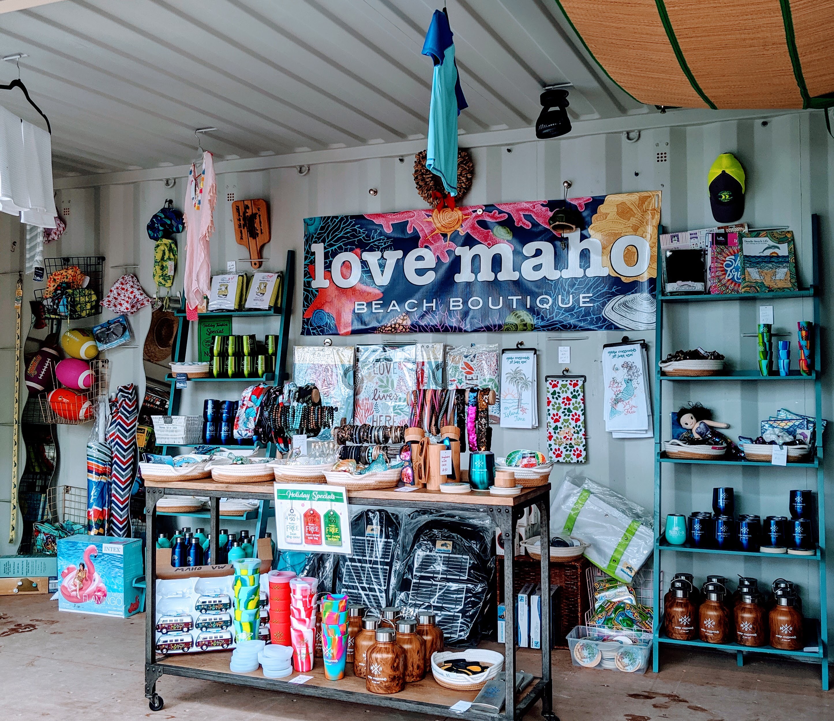 Maho Bay is sea turtle paradise – small agile turtles, big turtles with remora fish clinging to their shells, and huge ancient turtles that stare back at you placidly when you dive down to their level. Mike and I never got tired of calling out, “Look! Turtle! Look! Turtle!” from the cockpit. And when we got tired of snorkeling, usually coincidentally right around happy hour, we’d head ashore to the new Maho Collective. This combination tiki bar, food truck park, paddle board rental, and boutique has an inviting island vibe and feels like a backyard barbecue at your cool friend’s house. The owner, Dave lived in Vail for a while so we sat on a wicker sofa after closing time and told island stories and mountain stories. Fabulous guy that he is, he even bought all six of us a round of drinks!