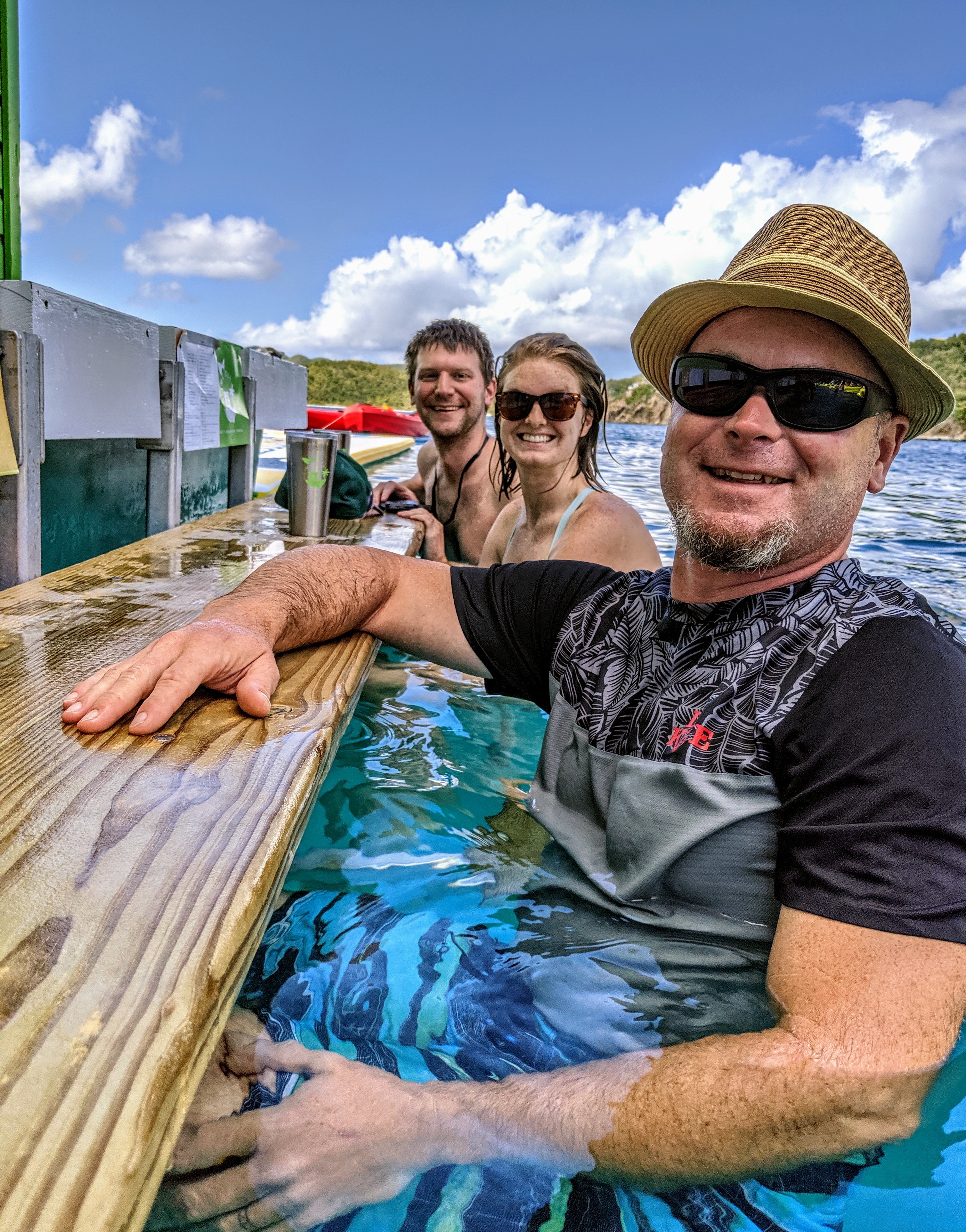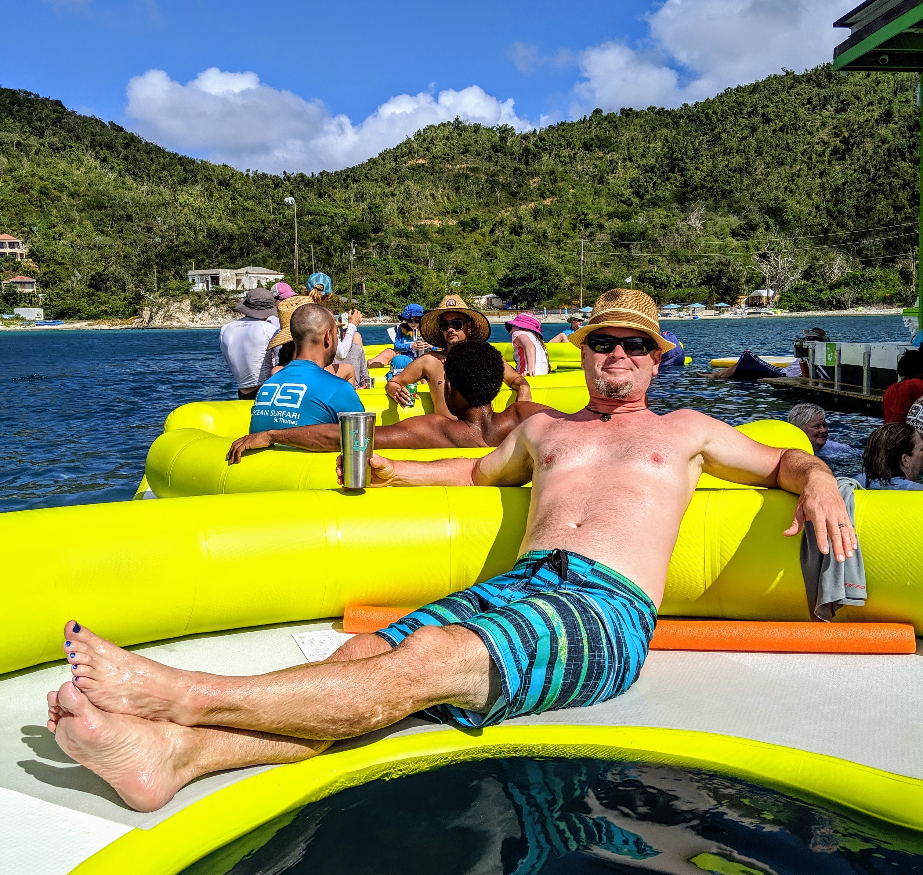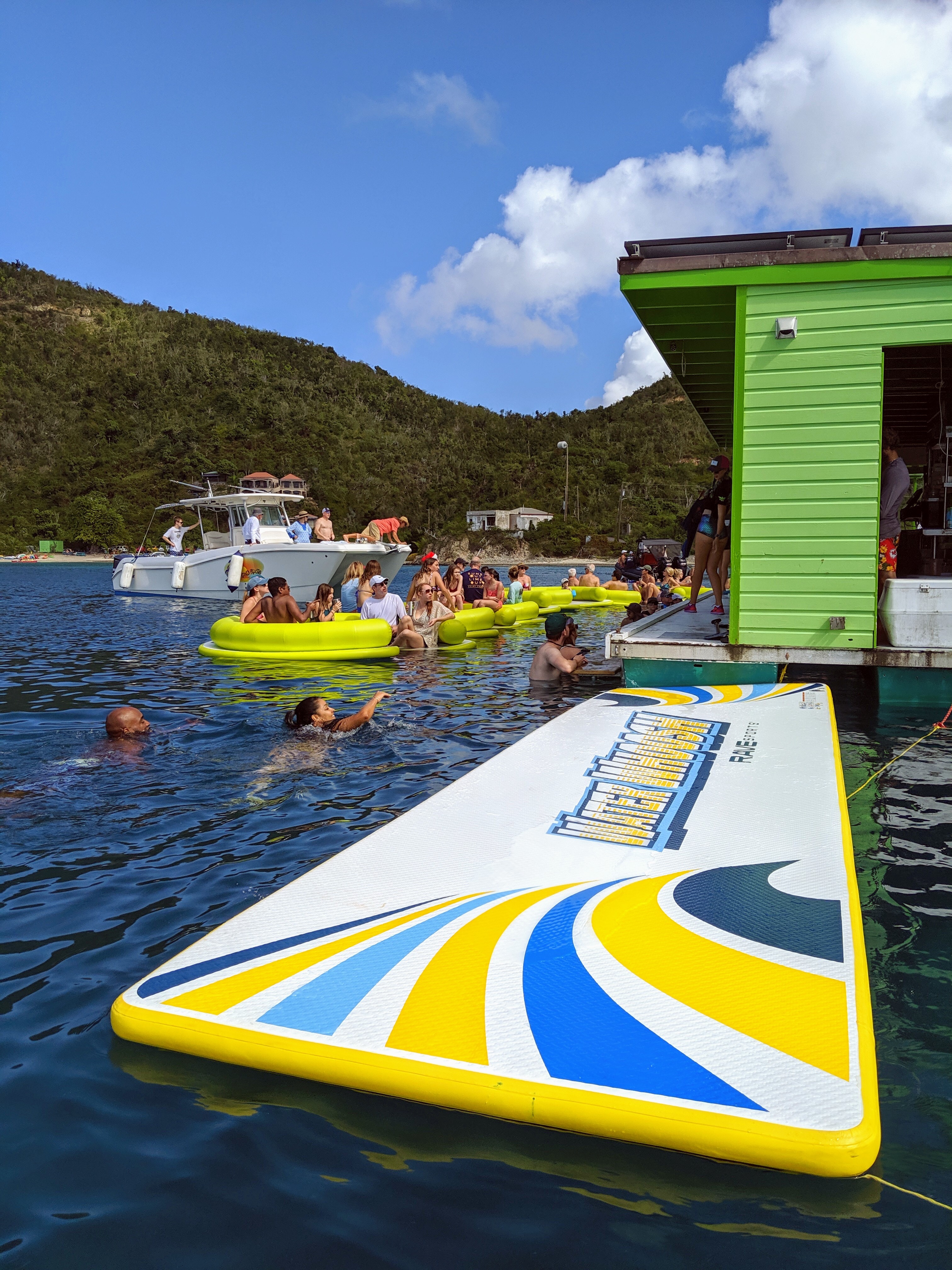 Lime Out is a lime green barge, only accessible by boat, kayak, or paddle board. Tie up, jump in the water, and drift over to one of the huge floats or to the swim up bar. Look over the short menu of gourmet tacos (think seared tuna, shrimp with pesto, or surf and turf) and craft cocktails. Place your order with one of the cheerful, efficient young waitresses who can answer any questions about ingredients and allergies. Even when the place is jammed with people, your order will come out super fast – drinks served in insulated stainless steel mugs, so no trash or single-use plastics. Tacos come in these cute little divided take-out containers made of compostable material. If you’re sitting on a yellow float, they’ll place your order on a pool float and give it a push to drift across the water to you. Finished, and have empty taco containers? The waitress reaches out with one of those long handled swimming pool skimmers to collect your trash. They’ve got this whole thing figured out. And speaking of trash, if you eat your scrumptious tacos at the swim up bar, a few scraps of guacamole or lettuce are bound to fall in the water. Never fear! A school of fish hang out under the barge just waiting to swoop in and snatch up your scraps. I have to admit, it’s a bit unnerving the first time it happens! When you get hot, slip into the water and borrow one of Lime Out’s swim noodles or floating chairs. When you get chilly, clamber up onto one of the sectional-couch-sized floats and chat with your neighbor. All in all, spending an afternoon at Lime Out is tons of fun.