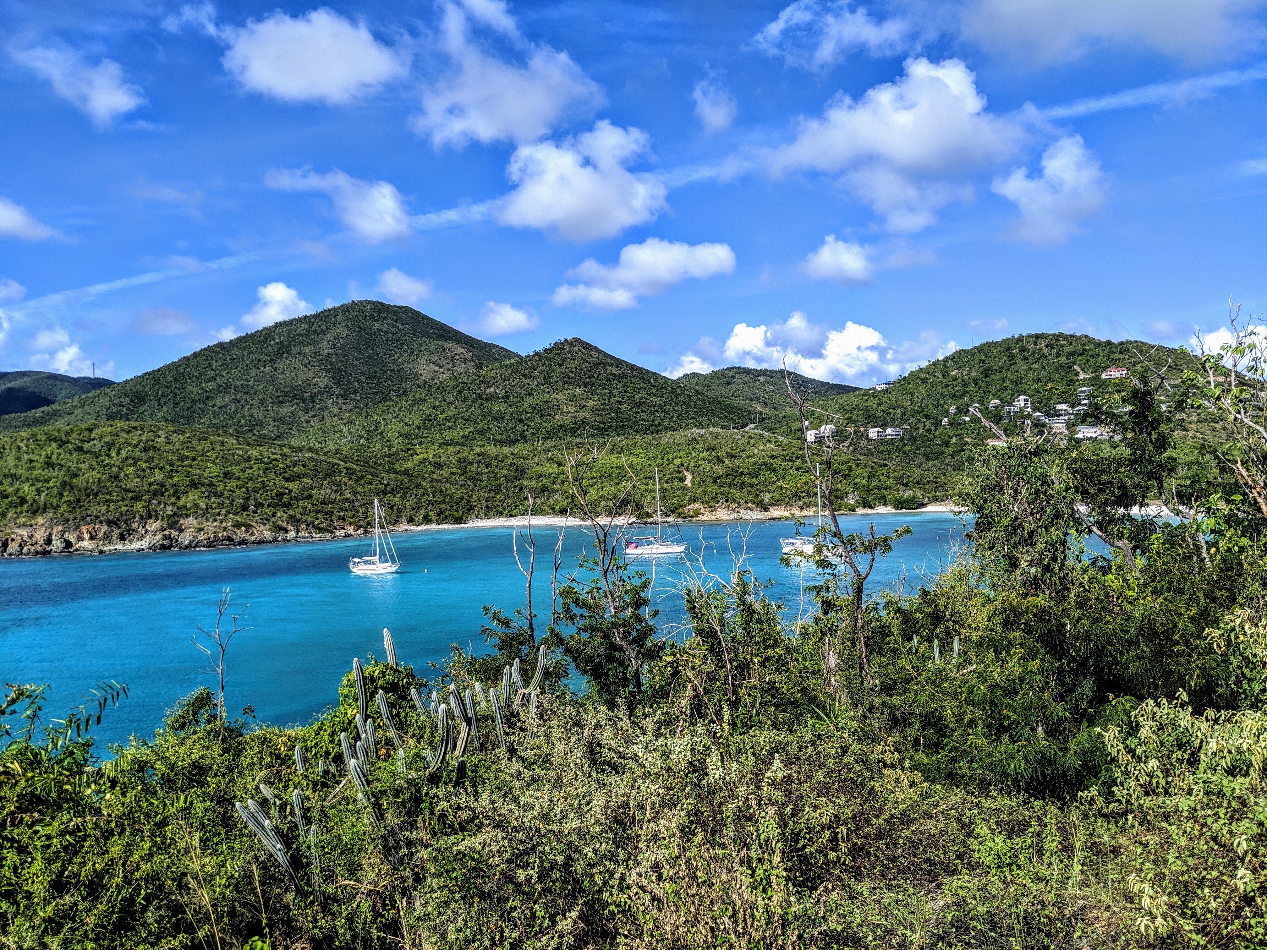 After all this traveling around, somehow the holidays snuck up on us. Southerly winds drove us away from St John’s south coast anchorages, so we turned the corner to the west coast and ducked into Cruz Bay on Christmas Eve. Cruz Bay is the “big city” on St John, with all the services we were missing after our stay in the park – grocery stores, hair salon, restaurants, and strong free wifi at the ferry dock. We certainly took advantage of all these things, and soaked up the tropical holiday atmosphere. As an added bonus, we caught up with Carina on Northern Star who we met back in St Petersburg, FL in 2017. At the time, she and her husband and two adorable dogs were in the process of moving from Texas to the Virgin Islands on their sailboat. Lots of fun to check in two years later to find out how it went, and how much they are enjoying their new island home!