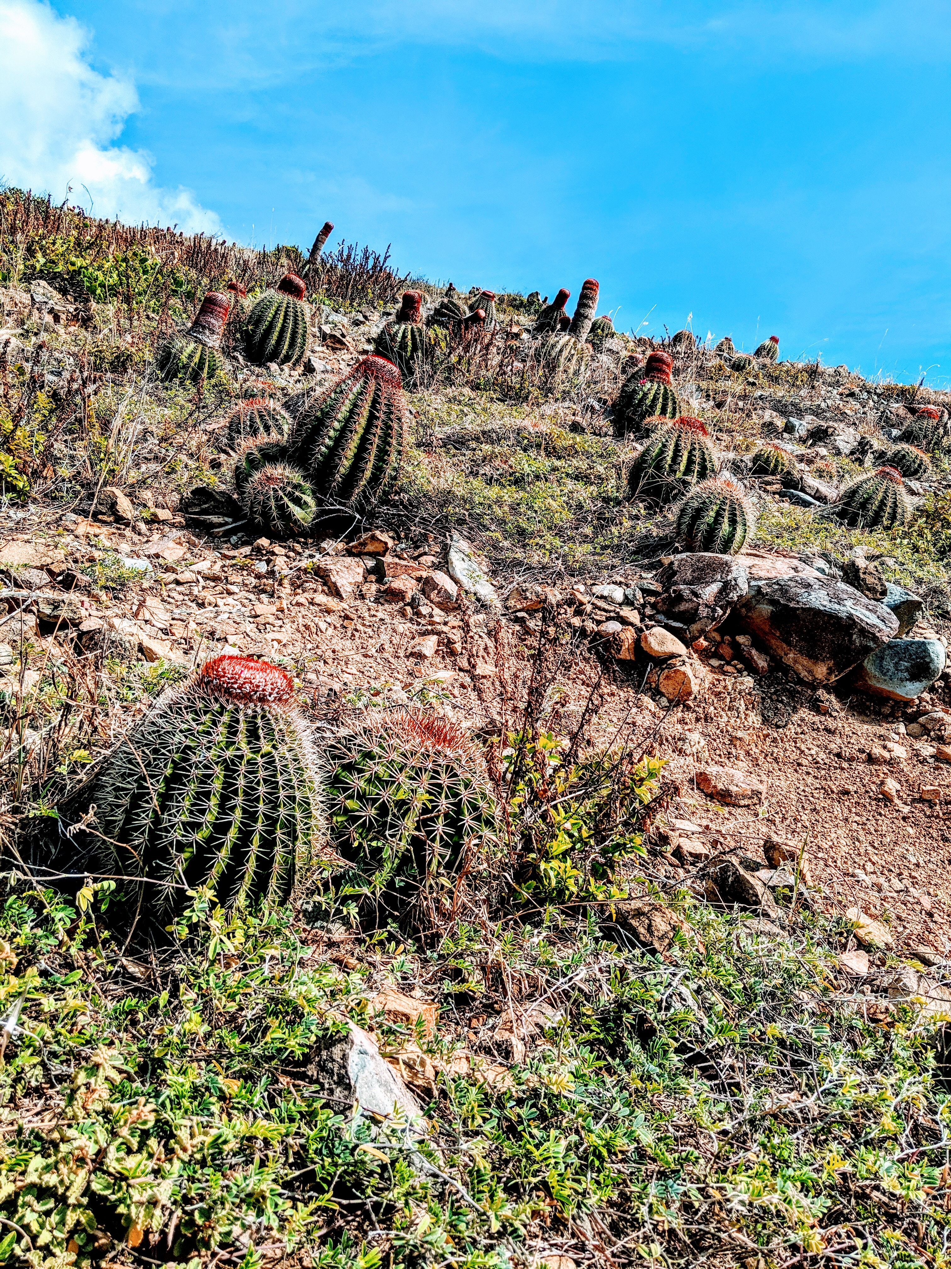 After the Lime Out restaurant raised anchor and motored away on Sunday evening, Sanitas was left alone for a quiet evening. The next morning, we ducked around the corner to Salt Pond Bay, back inside the park. The beach here is a bit off the beaten path, and it’s quieter than on the north shore. From the beach, there’s a lovely easy hike to Ram’s Head with wonderful views. The trail meanders through clusters of barrel cactus with bright red blossoms. If you look closely, you’ll find a few with bright pink fruits shaped like chili peppers that grow right out the top of the cactus. Very cool! If you’re visiting St John, the hike to Ram’s Head is a must!