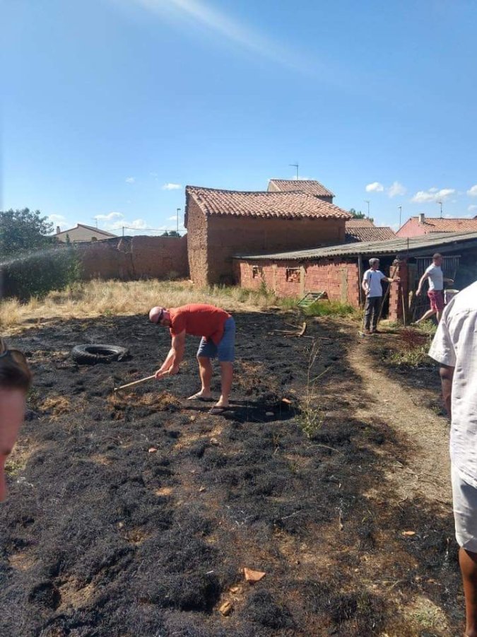 After a shower, Mike and I were sitting at a table in front of the albergue with a snack chatting with other pilgrims when a cloud of grey smoke rolled up the narrow street. Locals sitting at the adjoining tables jumped up and hurried in the direction of the smoke. So we followed. It turns out that all of the dry grasses and vegetation in a 500 sq ft courtyard had caught fire, with a spark rapidly spreading across the entire space. If the shed or house caught fire, the entire street of connected but brick and wood buildings could be lost. With no firefighters in sight, the villagers (and a few pilgrims) grabbed rakes and shovels and tarps and beat the flames out. When the worst of the fire was contained, we all took turns pouring buckets of water on the embers and stamping on the sparks. I eventually decided it wasn’t the smartest idea to do so wearing sandals! I didn’t take photos during the fire (it seemed ghoulish) but here’s Mike in full Bombero (Spanish firefighter) mode as things were calming down. When we returned to our table in front of the bar, two of the local men thanked us for helping.