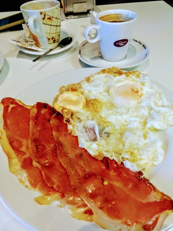 1. It’s filling. Focusing more on quantity than quality, a cheap pilgrims’meal will probably include french fries, pork, eggs… or all three!
