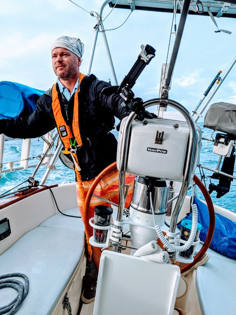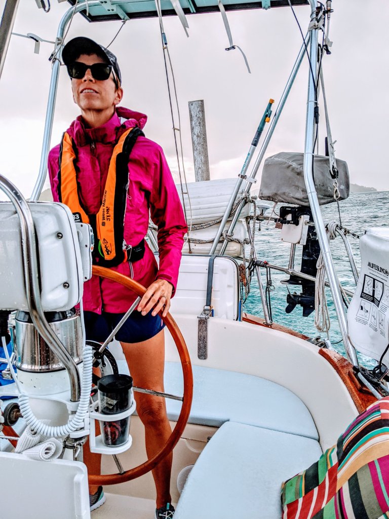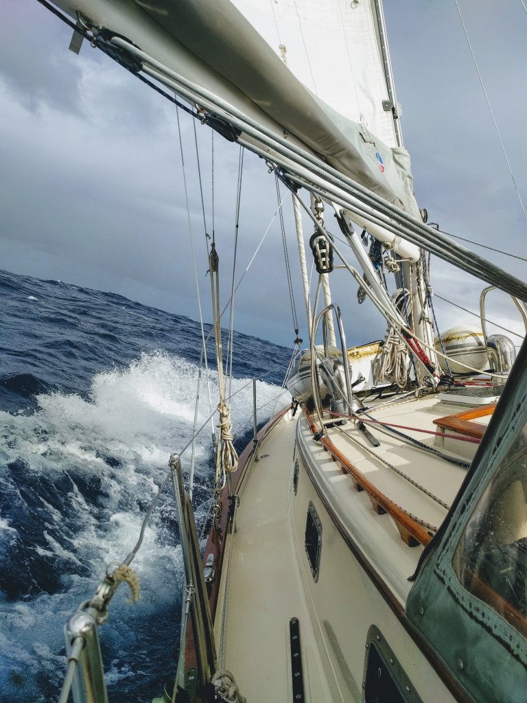 So I cooked a big dinner, prepped everything for the sail, and set the alarm for 5am. We’re definitely out of practice with these early starts, but we were anchors up and outside the harbor channel by official sunrise at 6:02 am. Conditions were definitely “sporty” all day with winds over 20 knots and very high waves hitting us on the beam and knocking Sanitas sideways. As we rounded the point at the southeast corner of Guadeloupe, seas were very confused causing a “washing machine effect” and I found myself feeding the fishes a little bit of last night’s dinner. Capt. Mike was amazing all day. He stayed at the helm for over 12 hours, through rain showers and crazy seas, managing the sails, adjusting course to get us to Antigua as directly and quickly as possible. Floatation device on and tethered to the boat, at one point a big wave crested over the cockpit, half-filling the cockpit with seawater. Good thing the cockpit scuppers (drains) weren’t clogged! On the positive side, there were absolutely no other boats out there to get in our way, and with those strong winds, Sanitas was flying! She averaged 6.1 knots over those 12 hours, which is absolutely unheard of! Conditions were never actually dangerous, and our sturdy 37 foot Pacific Seacraft handled it great, but it is just slightly possible that I am less hardy and tough than our boat. 😜