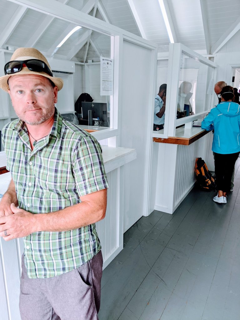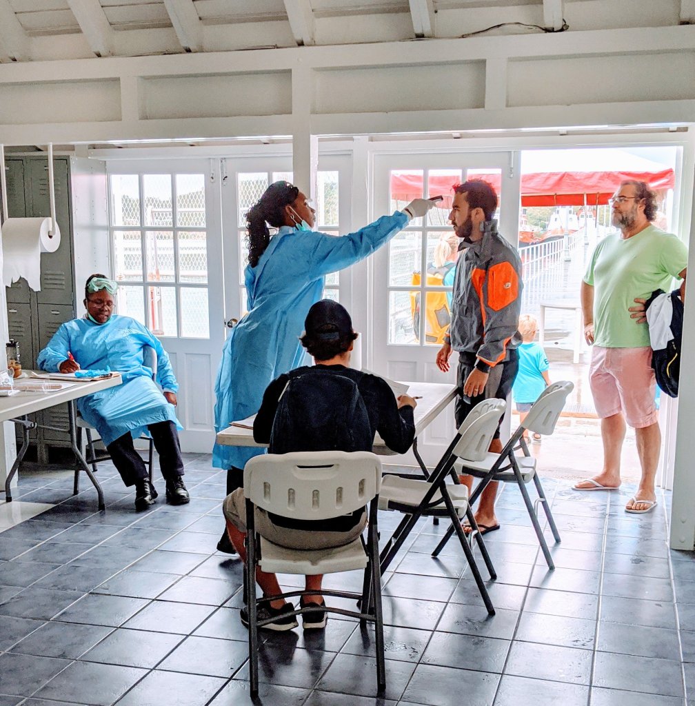 We made it as far along the Antigua coast as we could before sunset, but we couldn’t make it to the one remaining open port of entry in St John’s. So we dropped the anchor, raised the yellow Q flag, had a bowl of soup, and went right to sleep. After another early start, with a coast guard boat escorting us part-way, we sailed into the channel of St John’s, the capital of Antigua and Barbuda. It’s an industrial port, and sailboats rarely come here. We hailed the port authority on the VHF radio to let them know we were coming, dropped anchor in the middle of a bunch of other boats all flying the Q flag, lowered our dinghy into the water and headed ashore. The building at the top of the dinghy dock has been turned into a new customs and immigration office. As soon as we walked through the door, we were asked to sit down at a card table and had our temperatures taken and recorded. An officer from the Antiguan Health Ministry asked us a series of questions about our travel history and current state of health: “Which countries have you visited in the past 30 days?”, “Why did you return from Guadeloupe?”, “Have you had any crew members join and leave your vessel?”, “Have you visited any of these countries?” We filled out several sets of forms and they all got gathered into our file. The Health Minister signed off on our entry and sent us to Customs and Immigration. We were immediately asked for the missing clearance paperwork from Guadeloupe. Luckily, the customs officer allowed Capt. Mike to write a letter to the government explaining the reason for the missing papers. After standing in a few more lines, and paying a few fees, we were in! We have a 90-day immigration visa, a 30-day cruising permit (renewable) and no restrictions on moving between anchorages.