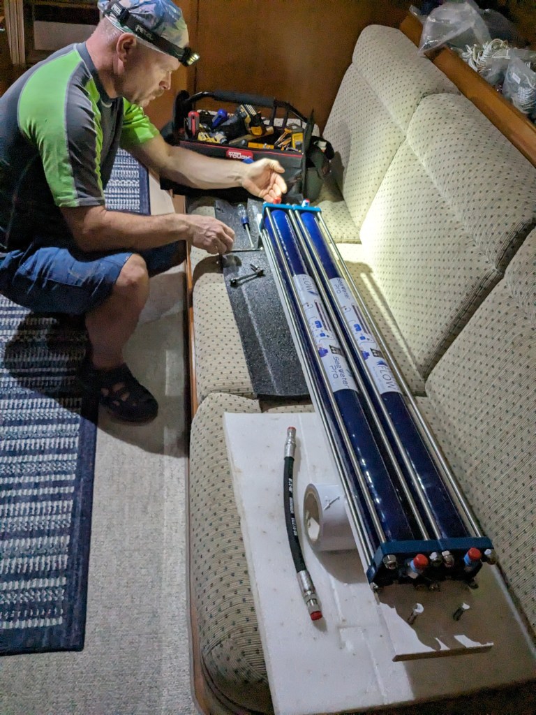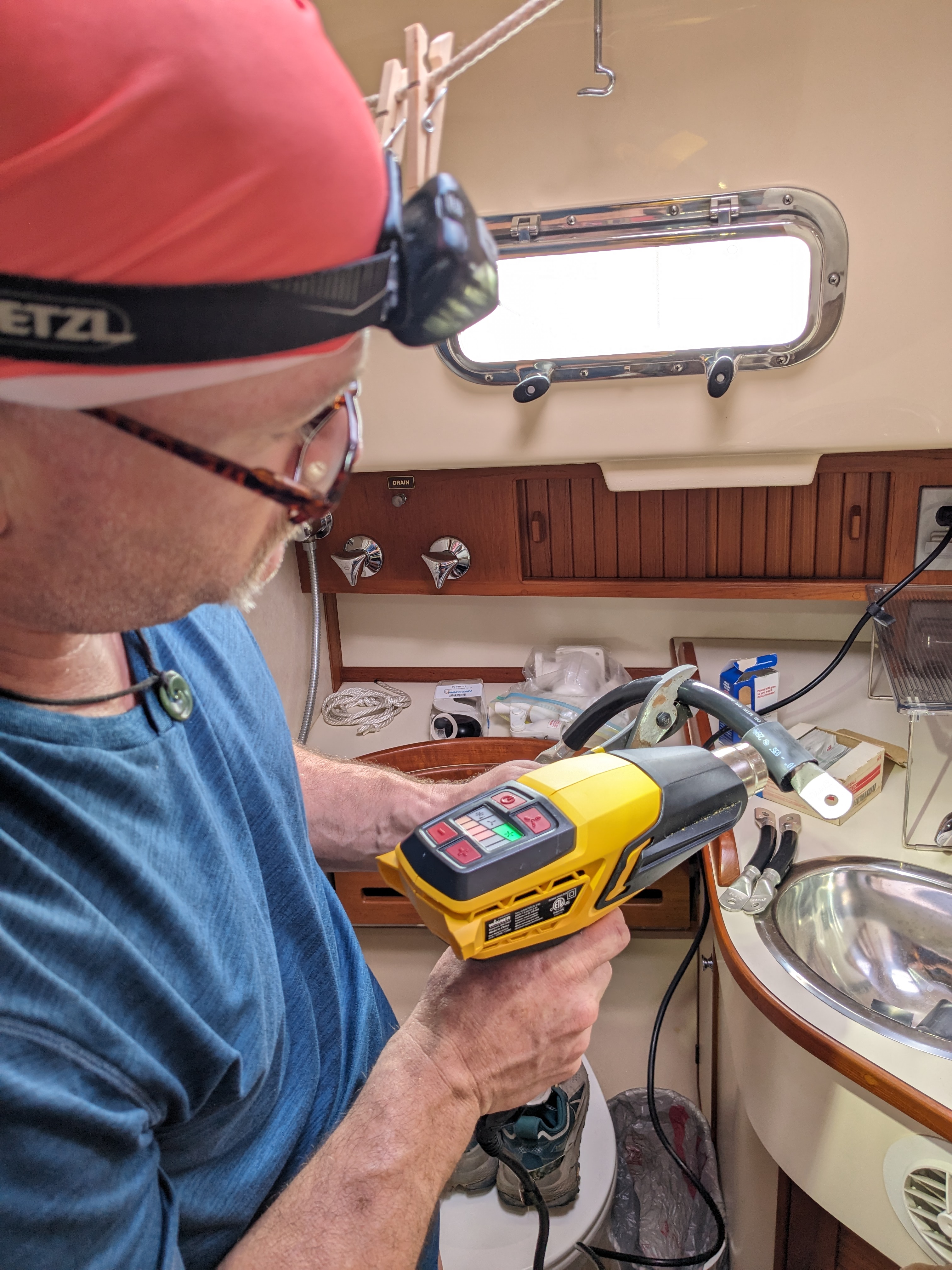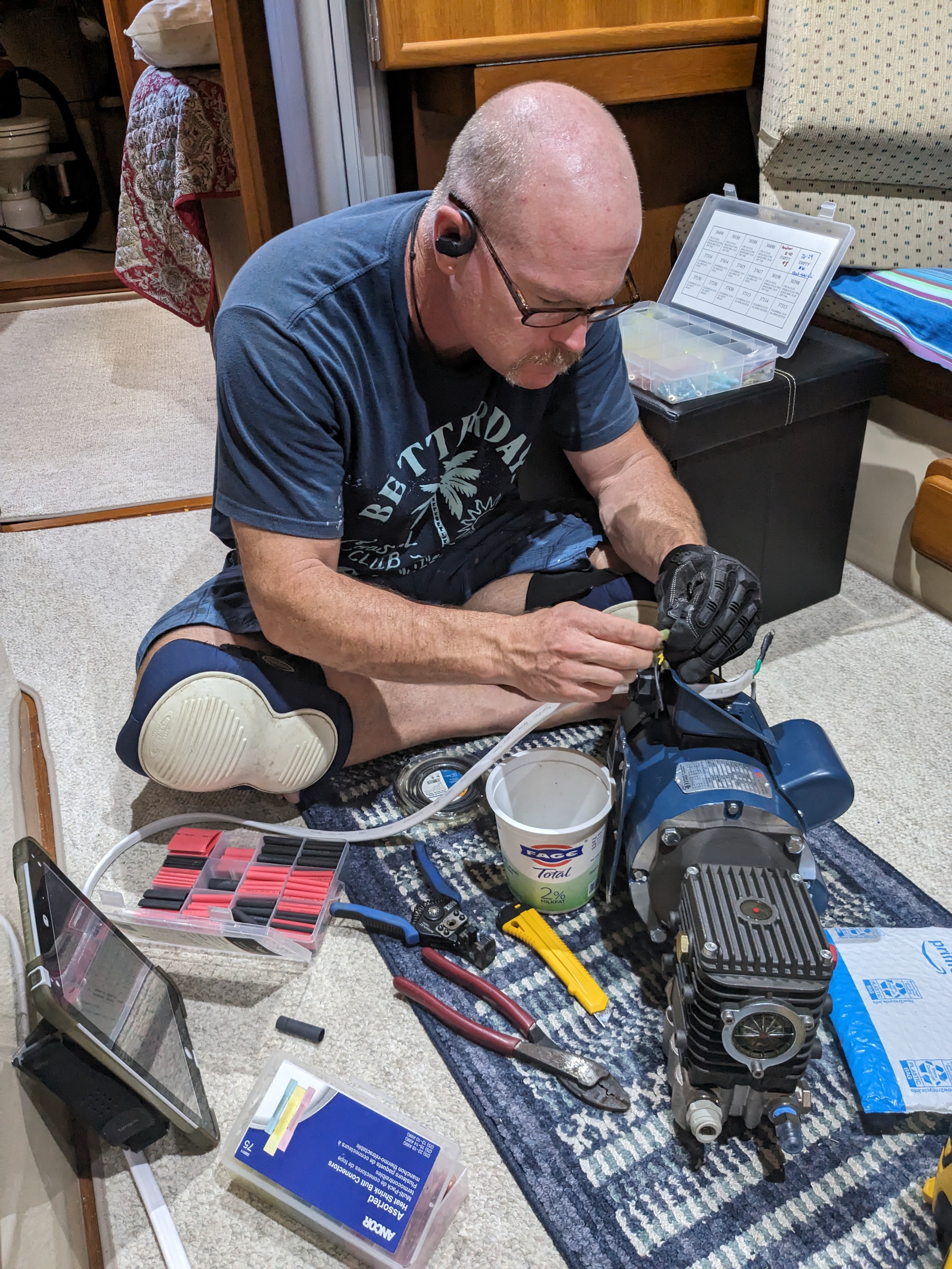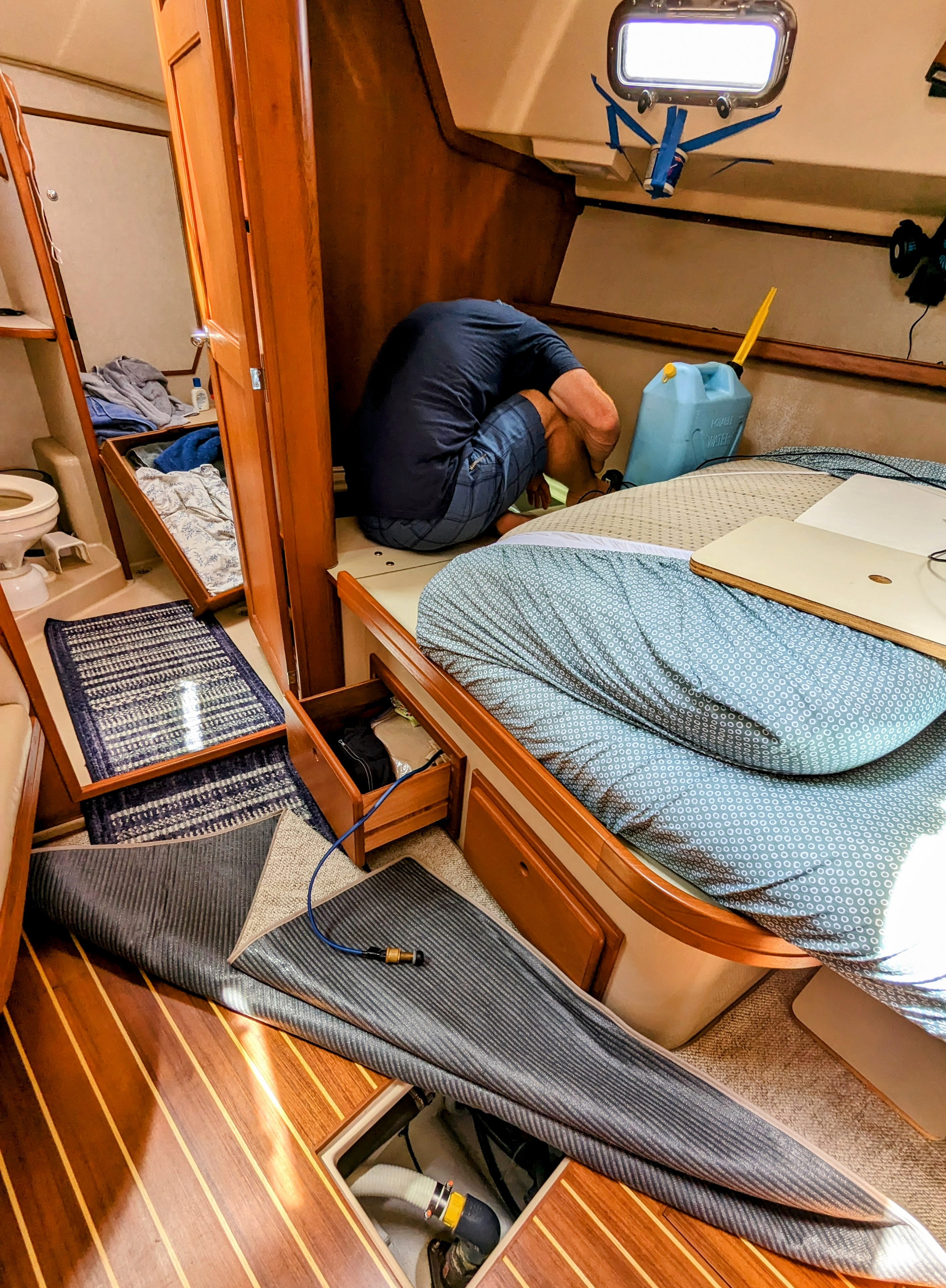 Capt Mike had to figure out where to locate the components of the system (long membranes, water filters, high pressure pump, boost pump, and control panel), and how to connect to the plumbing and electrical systems. At one point, he got frustrated and told me to watch the videos and help him figure out the electrical. I watched each video three times, took pages of notes, and finally announced my findings “They don’t tell you how to connect to the generator and to the boost pump!” Capt. Mike confirmed “That’s exactly my point” 🤦♀️ Luckily, they have excellent customer service and tech support and a couple of phone calls gave us enough info to move forward. It took about a month in total to complete this install, with Capt. Mike contorting his body into every tight hold on the boat. We think he’s got it done! Now to anchor in a place with clean ocean water to test it all out!