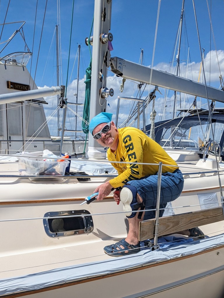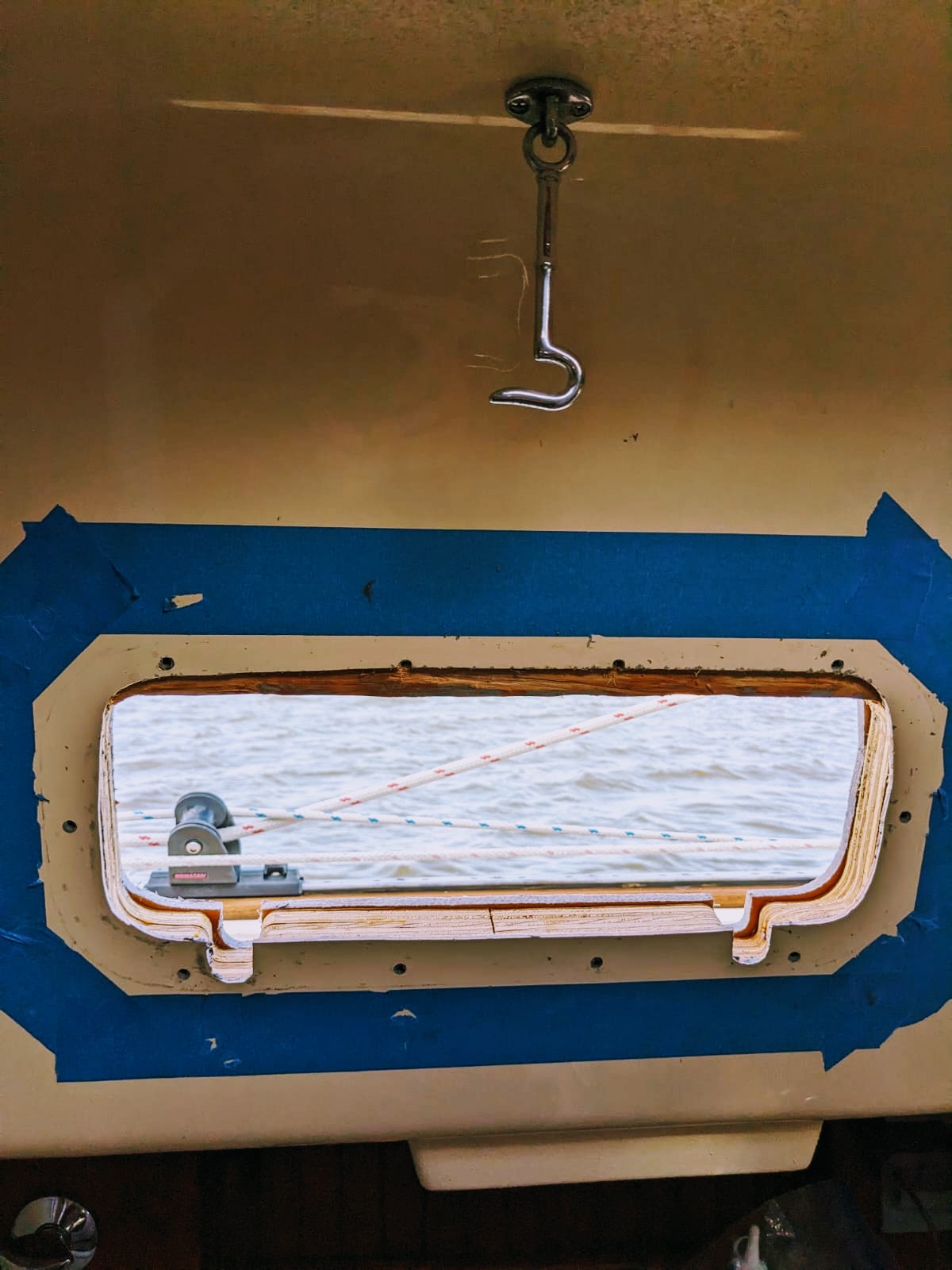 One of our biggest projects was removing all of the portlights (aka boat windows), scraping and cleaning them, and rebedding. In Florida spring thunderstorms, we had water running down the inside of the salon “walls” and collecting inches of water in our drip cups. We decided to repair all the portlights, even the ones without visible leaks, after Capt. Mike installed a light in the galley and water streamed out of the screw holes, implying that some of the leaks were occurring between the hull and the lining. Each portlight took about 8 hours to address – removing with razor blades and pry bars, scraping old caulk and silicon off the stainless, cleaning, rebedding with new caulk, and cleaning the excess that squirted out during the process.