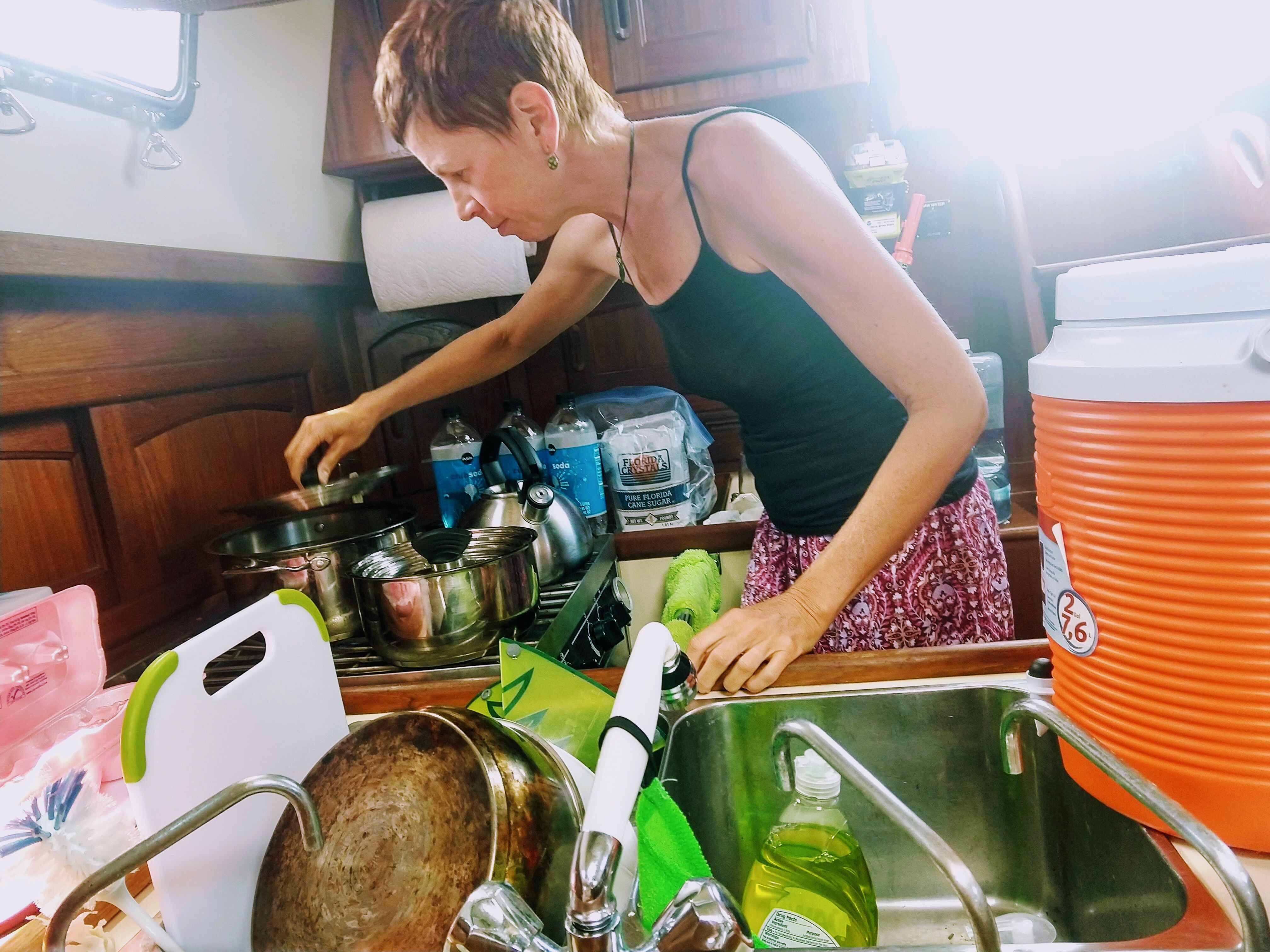 Another 2-mile walk back to the dock (we never seem to time the mini buses right here in Union Island), another dinghy ride (it’s not quite as wet in this direction) and then I have to clean and repackage all the veg. Take everything out of the plastic bags, check for bugs, pack in green produce bags to make things last longer, rotate the contents of my top-loading fridge to store the newest and most durable items on the bottom and the fragile things I need to eat first on top. While I’m at it, check the contents of the fruit hammock – make sure nothing’s going bad. And… Since I’m really on a roll…I found tiny bugs in the cornmeal last night. Good thing I package all my dry goods in sealed containers! But just in case, let’s take everything out of the galley cupboard, wipe everything down, and make sure the bugs didn’t escape their plastic prison. Phew!
