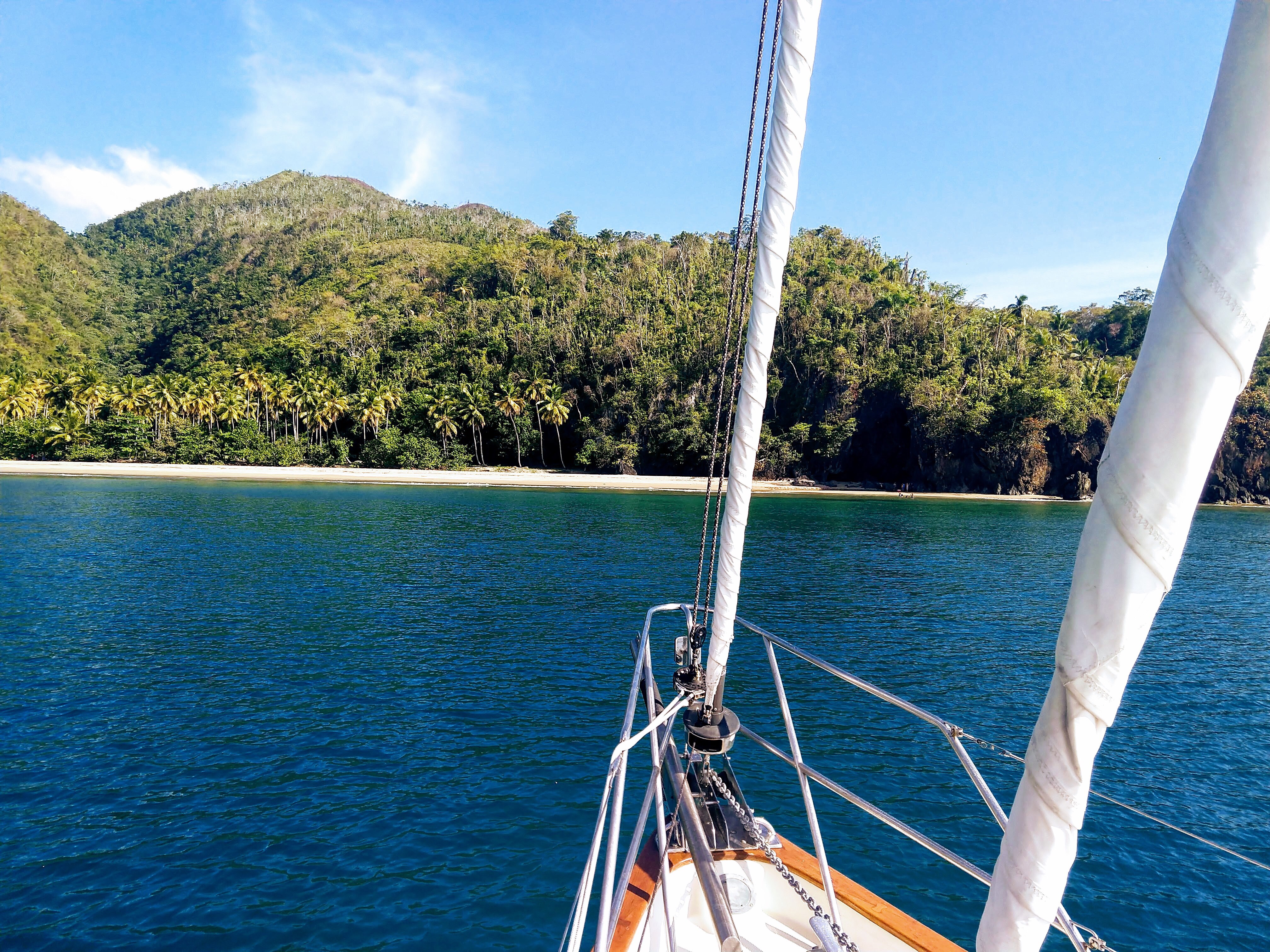 In preparation, we stocked up on red wine, bubbly, beer, and snacks. We cleaned from bow to stern both above decks and below so we’d be free to offer tours. And we dug out our stash of courtesy flags and strung them up on a halyard to make her look colorful and festive. We removed all traces of the original name from our boat (on documents, decorative items, safety equipment and books) and prepared a metal ingot with the original name. With our friends gathered on the dock, beverages for toasting in hand, Capt. Mike and I walked forward to the bow and began the purging ceremony of the original name….